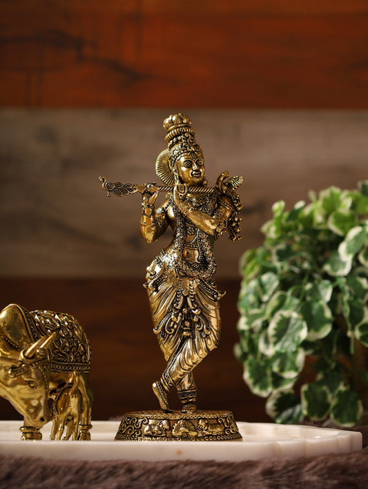 Super Fine Brass Krishna Standing On Pedestal 13''