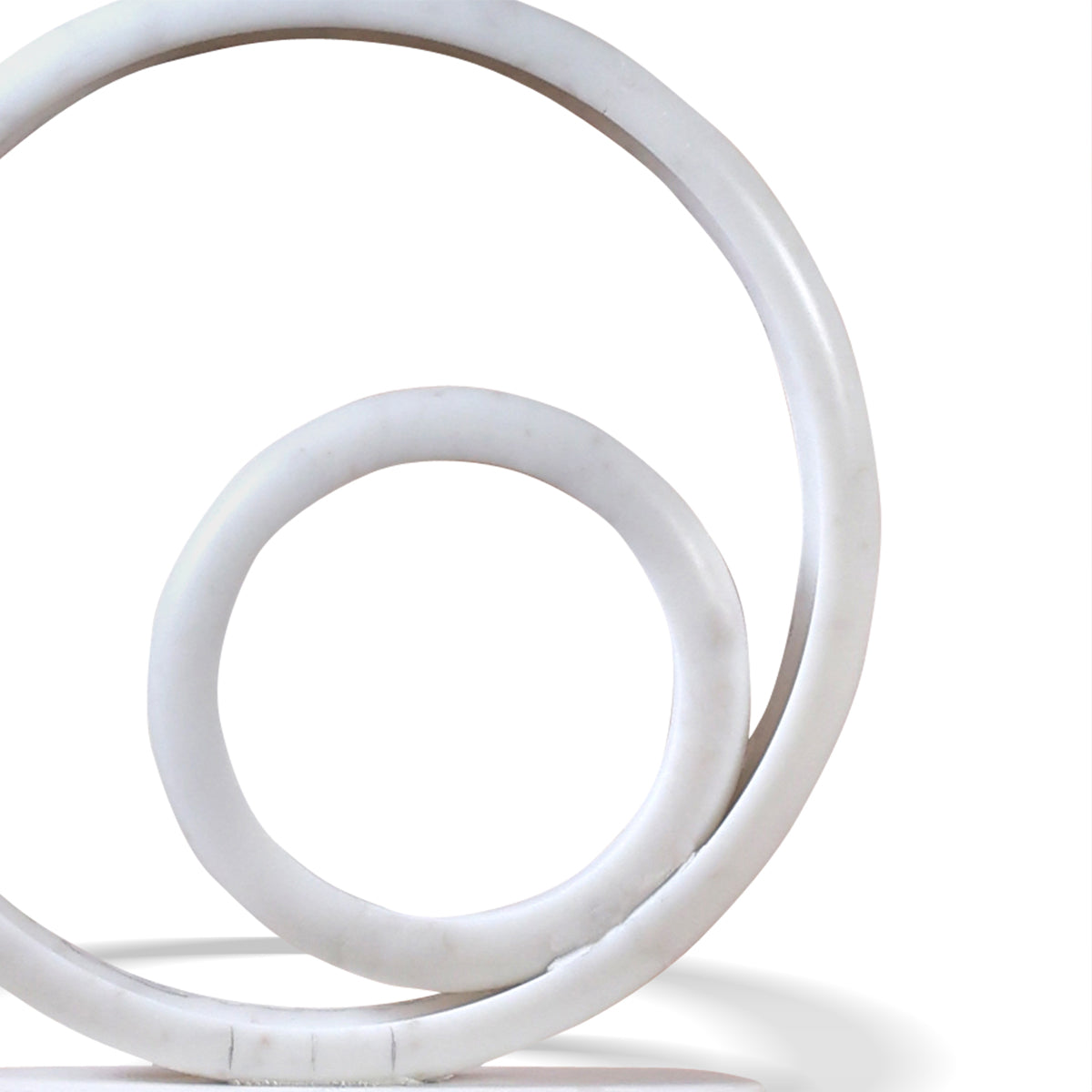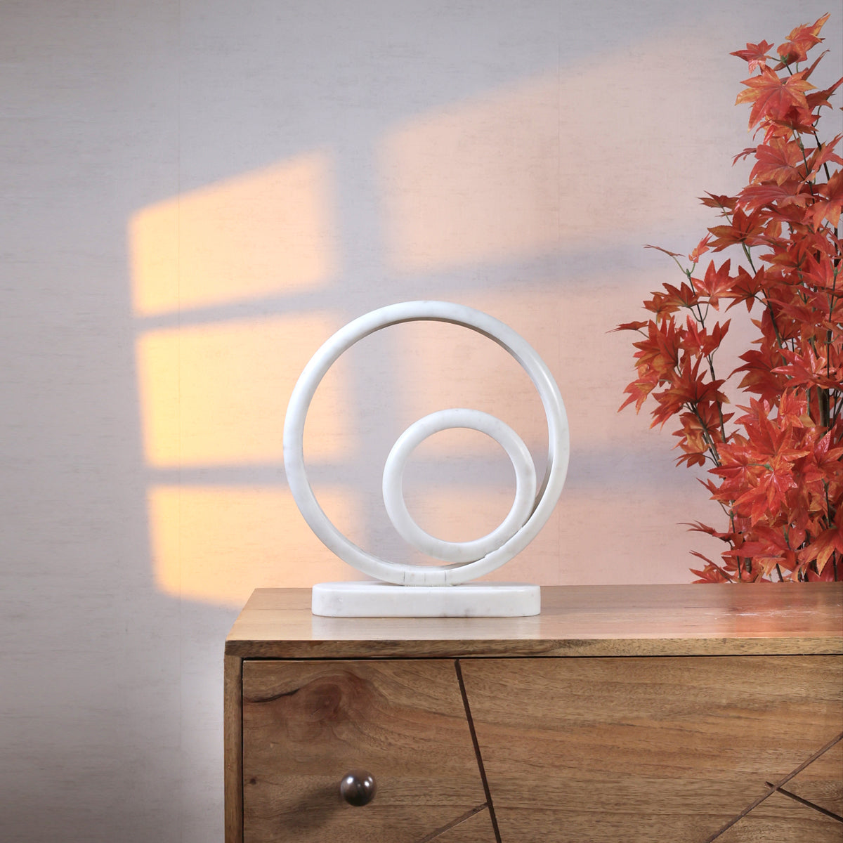 This elegant marble sculpture features two interlocking circular forms, symbolizing balance and infinity. With its sleek, minimalist design and smooth matte finish, it adds a touch of contemporary sophistication to any interior. Perfect for display on consoles, sideboards, or office desks, it embodies harmony and timeless style.