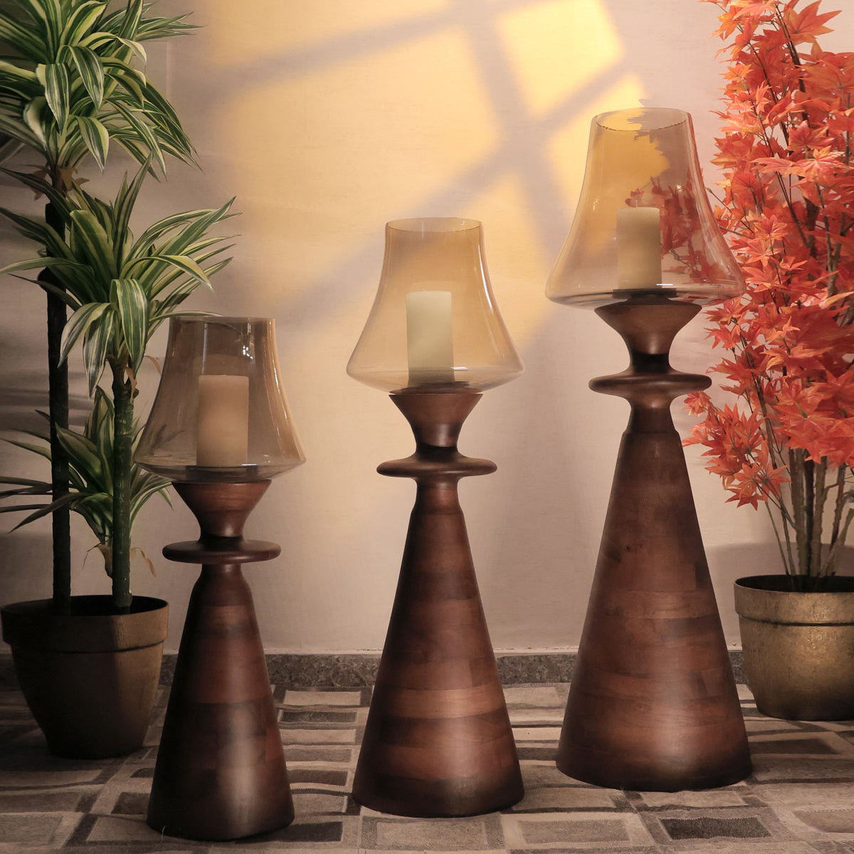 Infuse warmth and natural charm into your space with the Rustic Aura Candle Holder Set. Crafted in a rich bronze finish with gently flared glass shades, these candle stands create a soft, inviting glow. Their varied heights add visual interest and balance, making them perfect for console tables, living rooms, or cozy corners. A beautiful fusion of earthy tones and elegant design, this set enhances any décor style effortlessly.