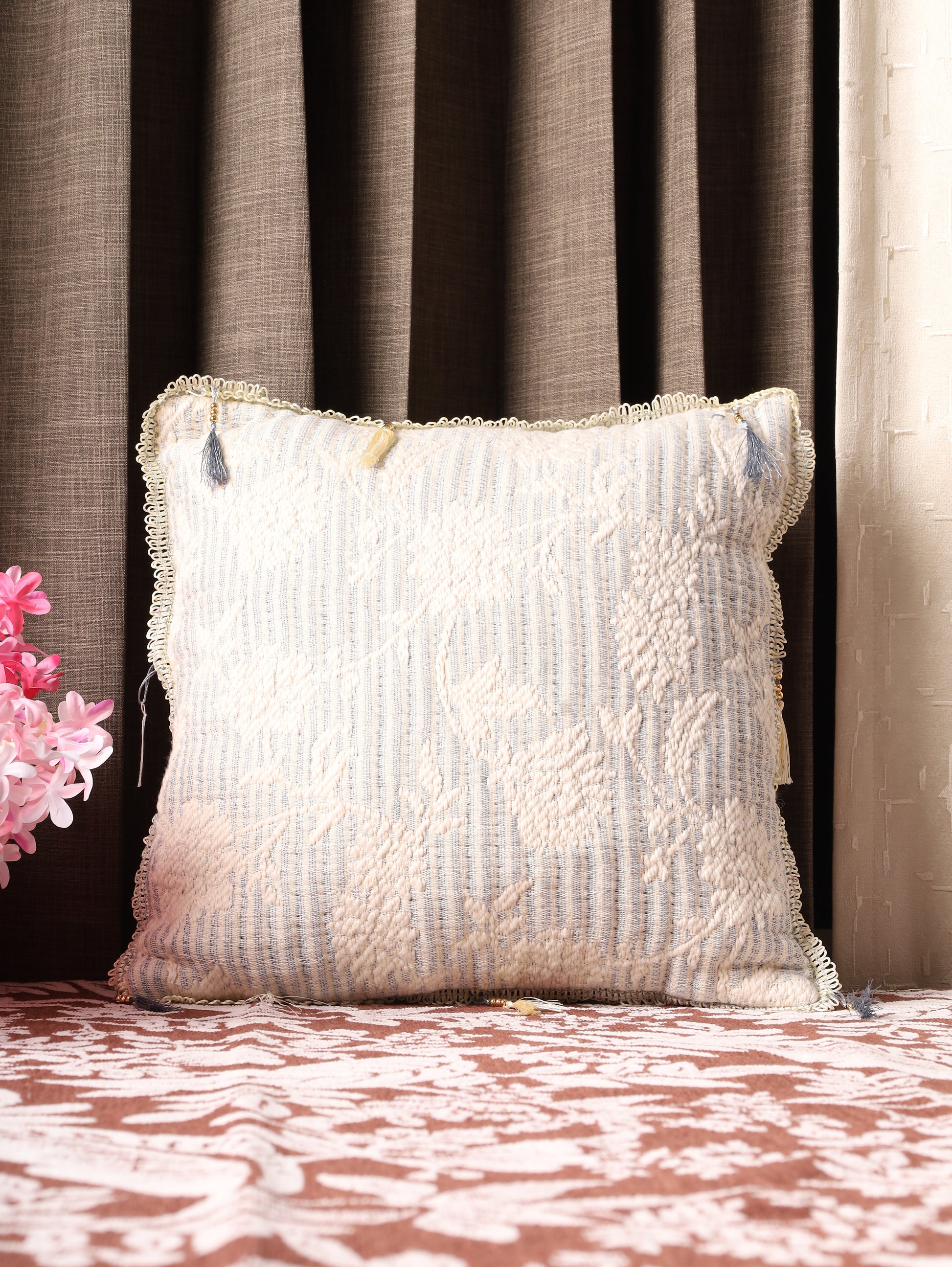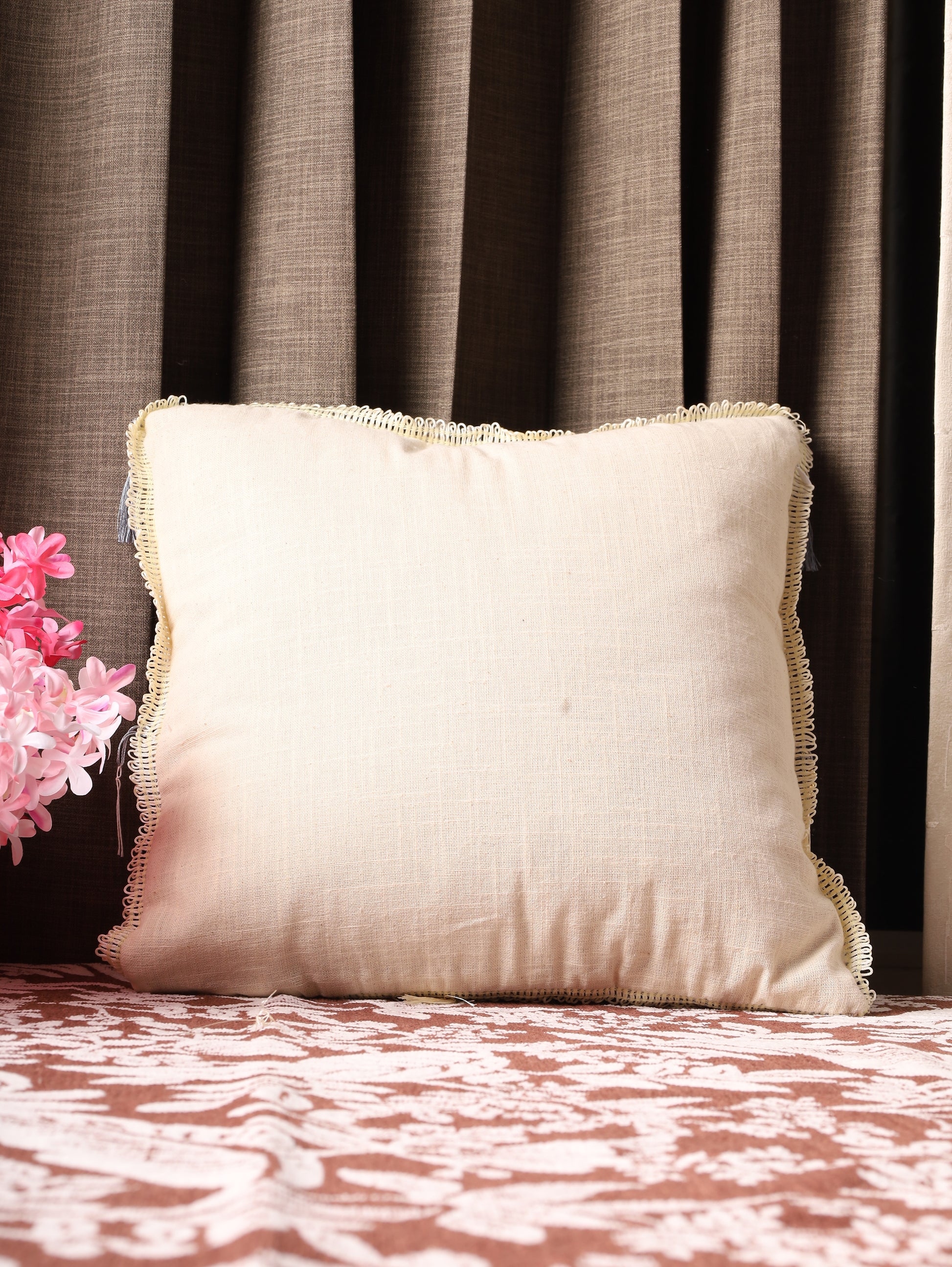 Elevate your home décor with this Elegant Embroidered White Cushion Cover, featuring intricate abstract stitching and delicate tassel accents on each corner. The soft, textured fabric brings a touch of luxury and calm to any interior. Perfect for minimalist, classic, or boho-inspired spaces. A refined addition to your sofa, bed, or reading nook.