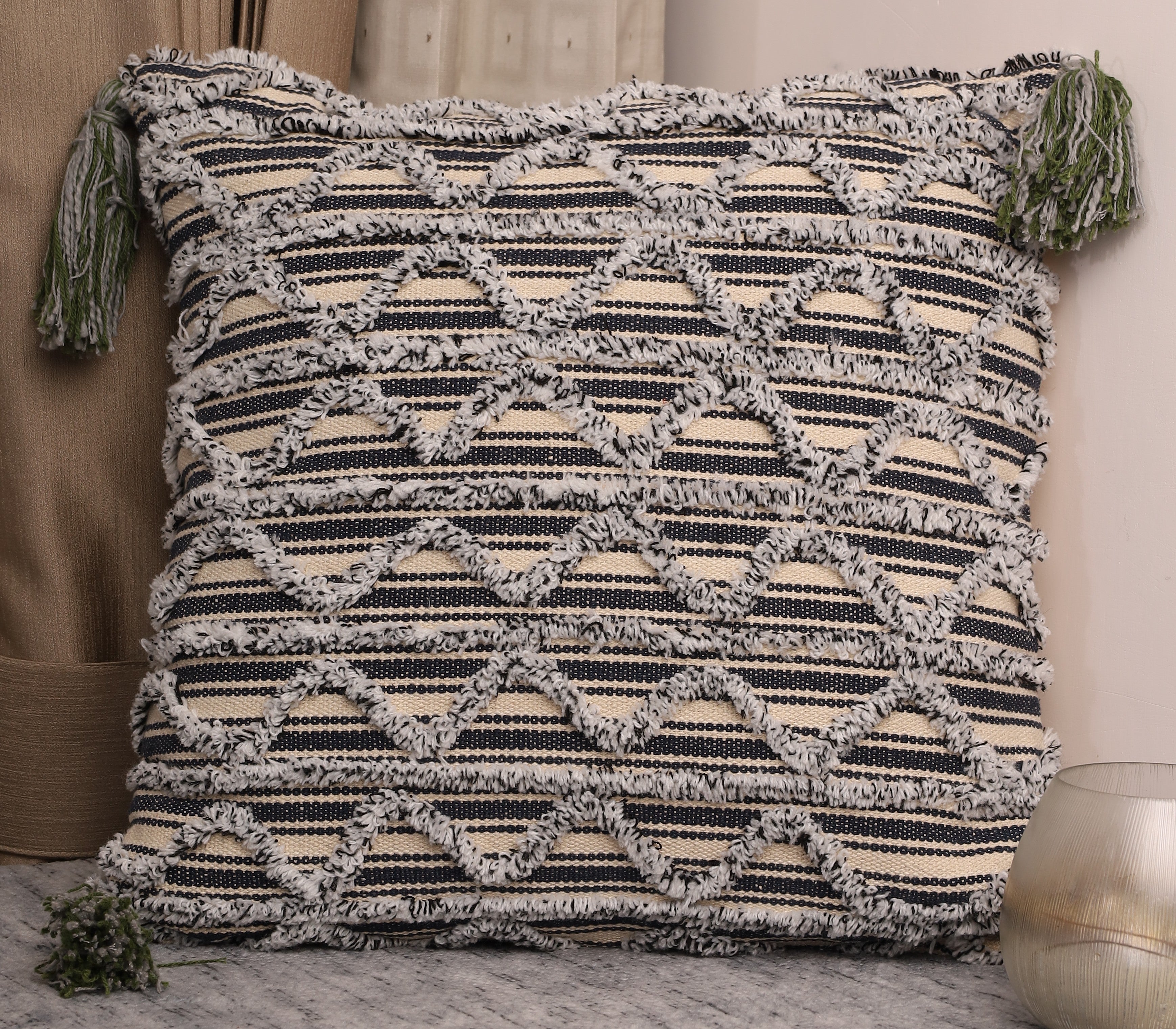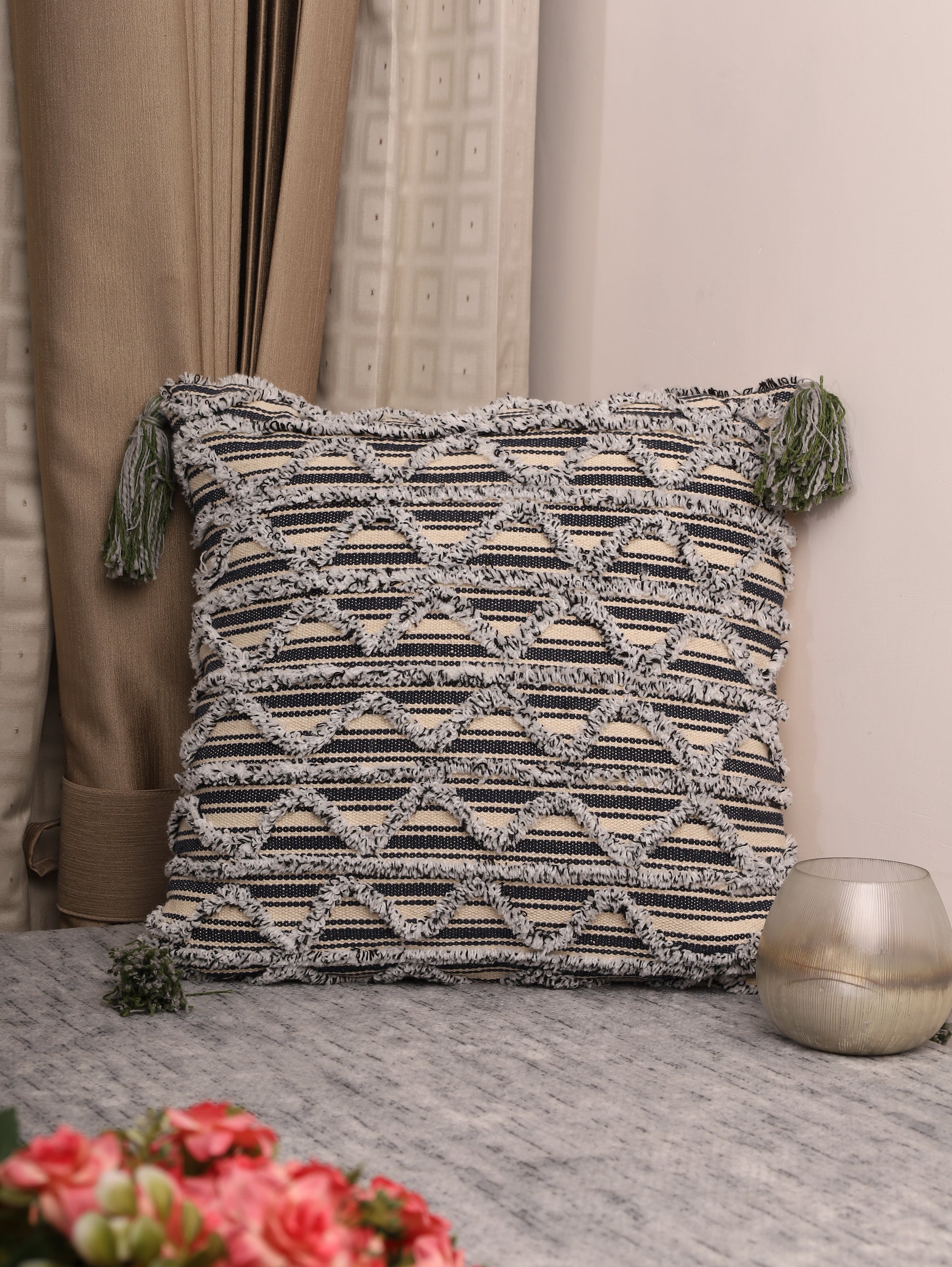 Inspired by desert textures, this Sahara weave cushion cover blends earthy stripes with raised diamond patterns for a unique tactile feel. The neutral tones and subtle yellow detailing create a balanced, cozy aesthetic. Finished with thick corner tassels for added charm.