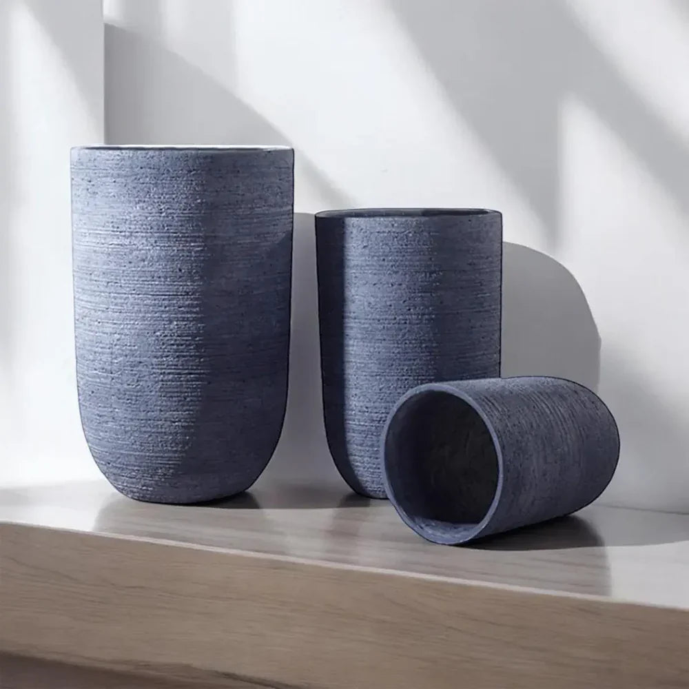 These sleek grey vases feature a subtle horizontal texture that gives them a contemporary and natural appeal. Their smooth cylindrical shape and neutral tone make them versatile for any decor style. Perfect for indoor plants or dried floral arrangements. Durable and stylish, they add an elegant minimalist touch to modern spaces.