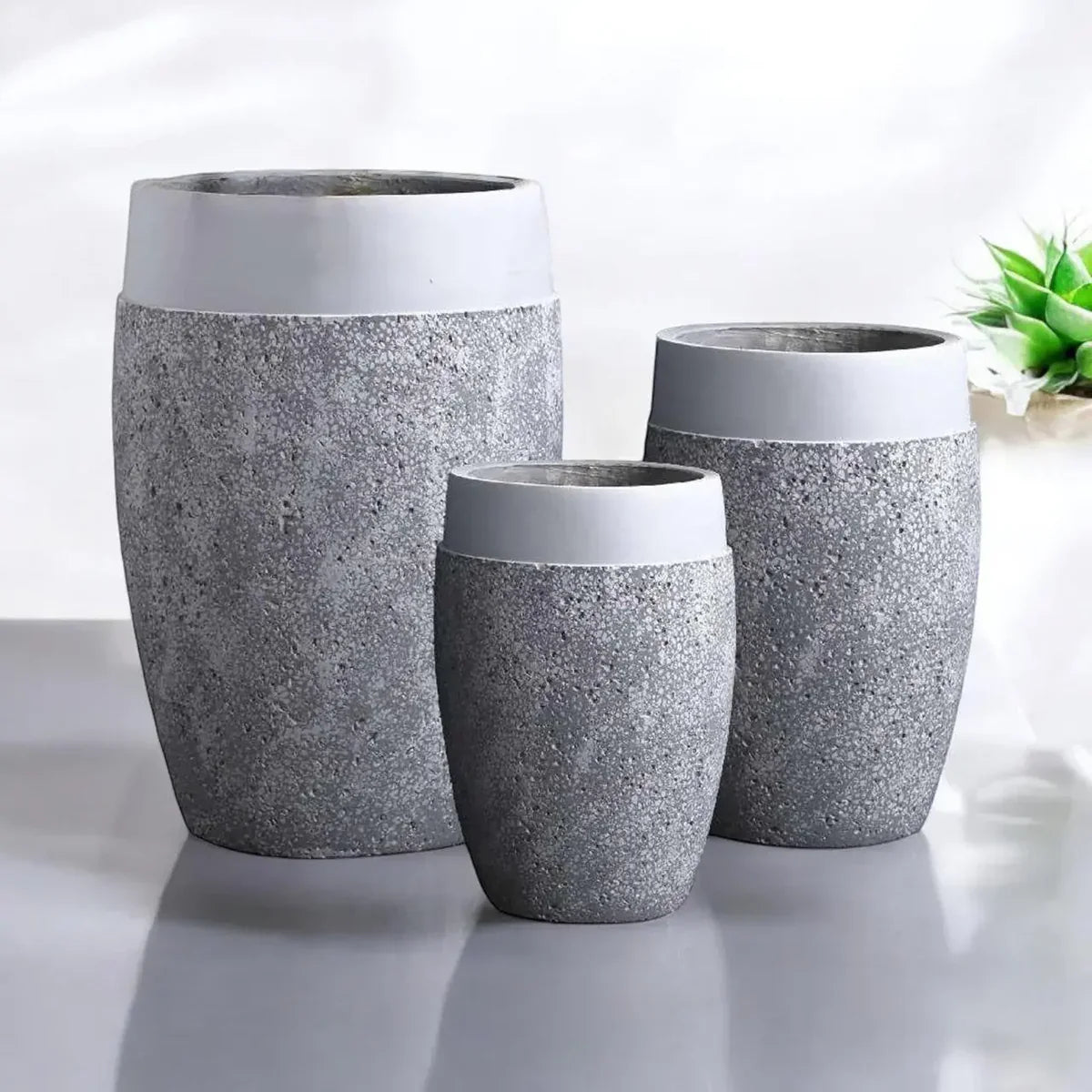 These stylish grey planters feature a modern stone-textured body paired with a smooth matte rim for a contemporary contrast. Their sturdy design and natural finish make them perfect for both indoor and outdoor decor. Ideal for showcasing large plants or small trees, they bring a sleek and earthy charm to any space. Durable, elegant, and versatile — a perfect blend of modern design and timeless appeal.