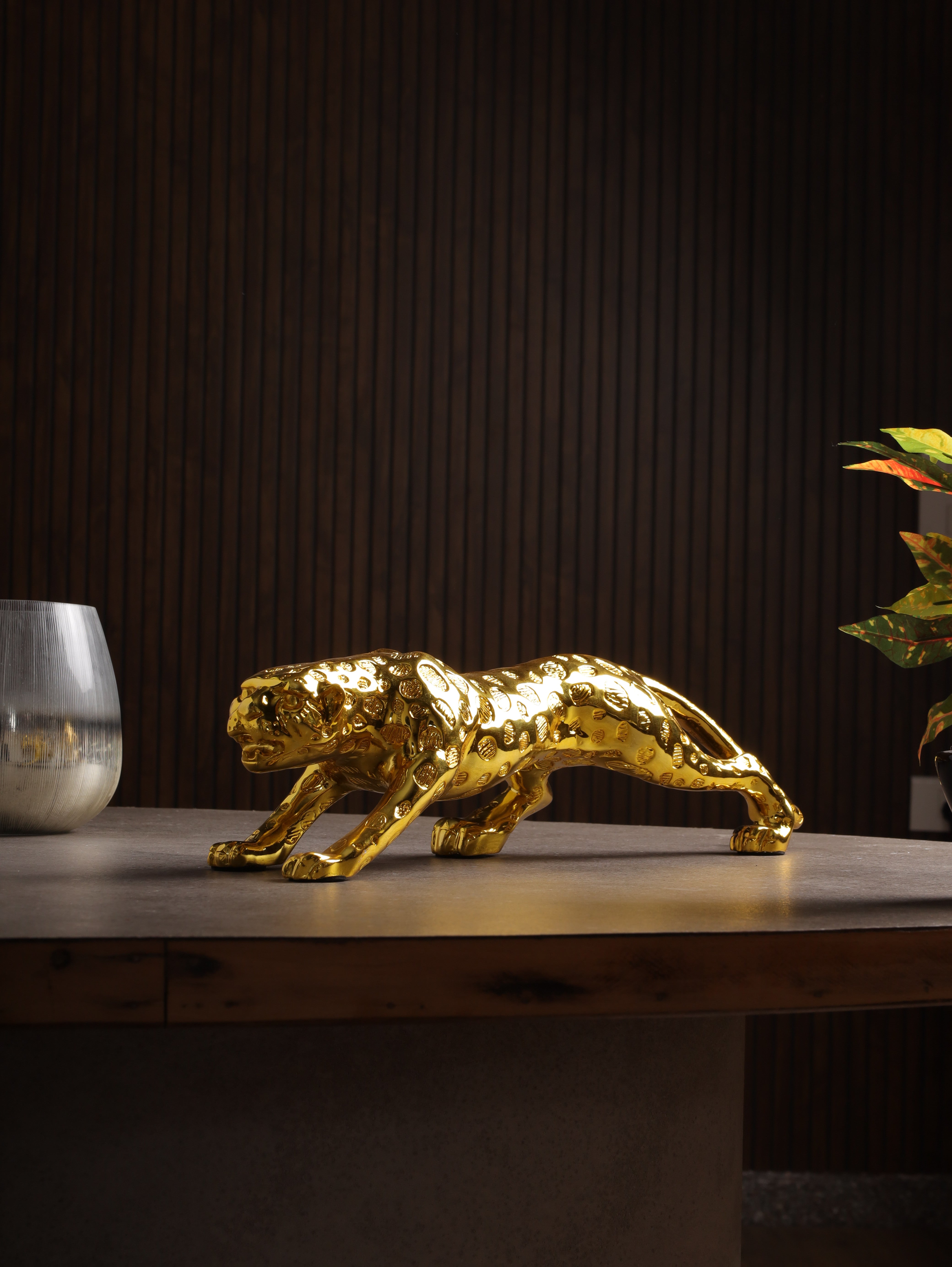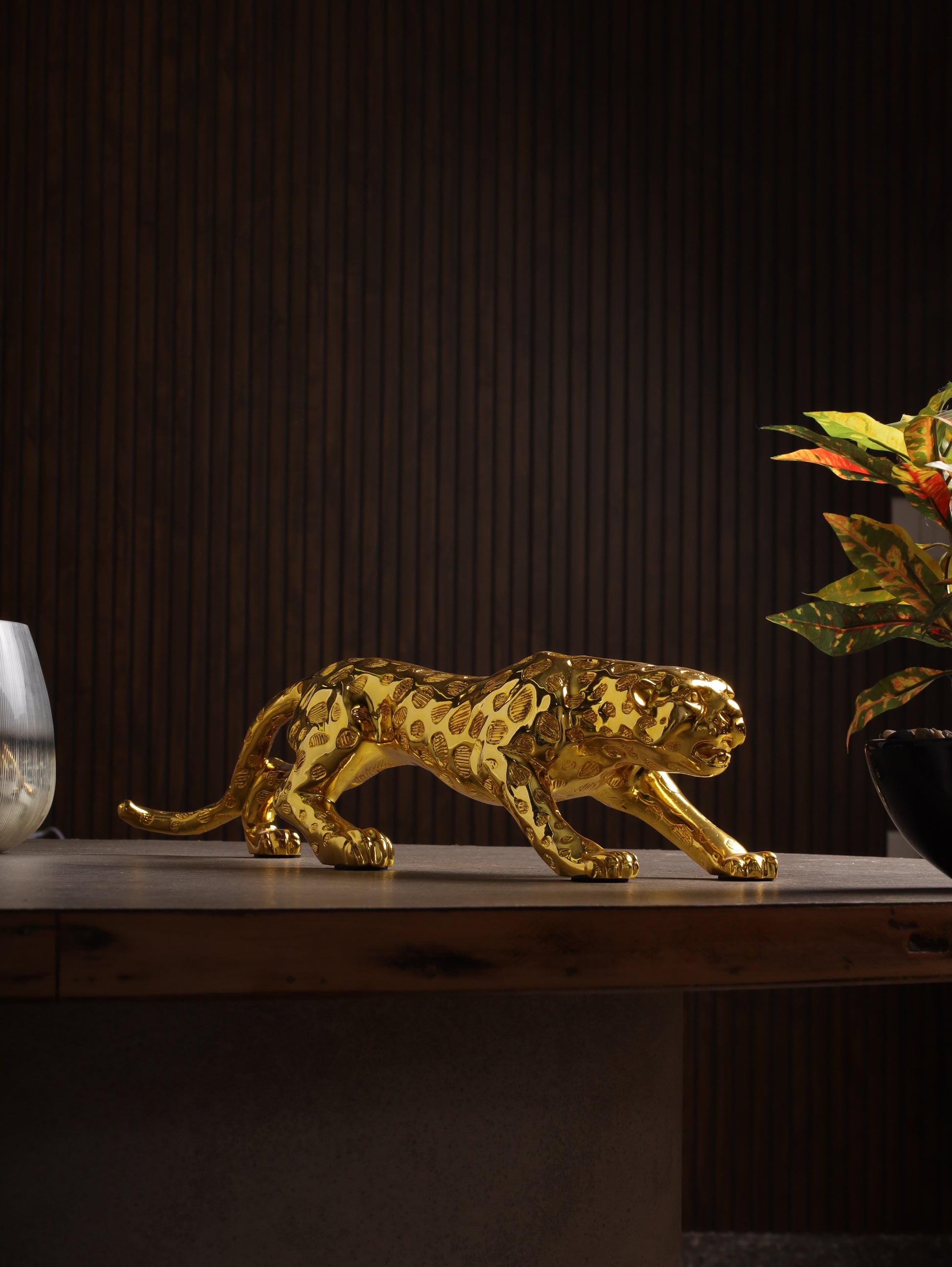 This sleek golden panther sculpture embodies grace, agility, and silent strength. Its poised stance and detailed craftsmanship make it a powerful statement piece for any modern space. Symbolizing confidence and determination, it adds a bold, luxurious touch to your decor. Perfect for those who appreciate elegance with an edge.
