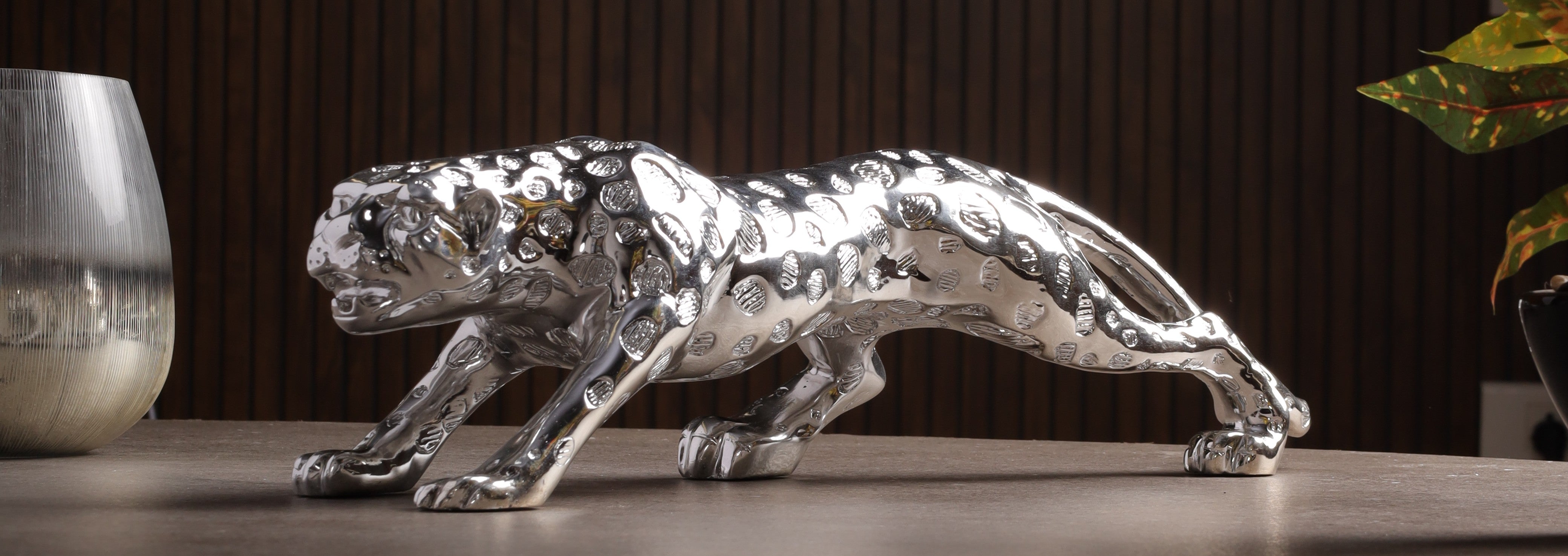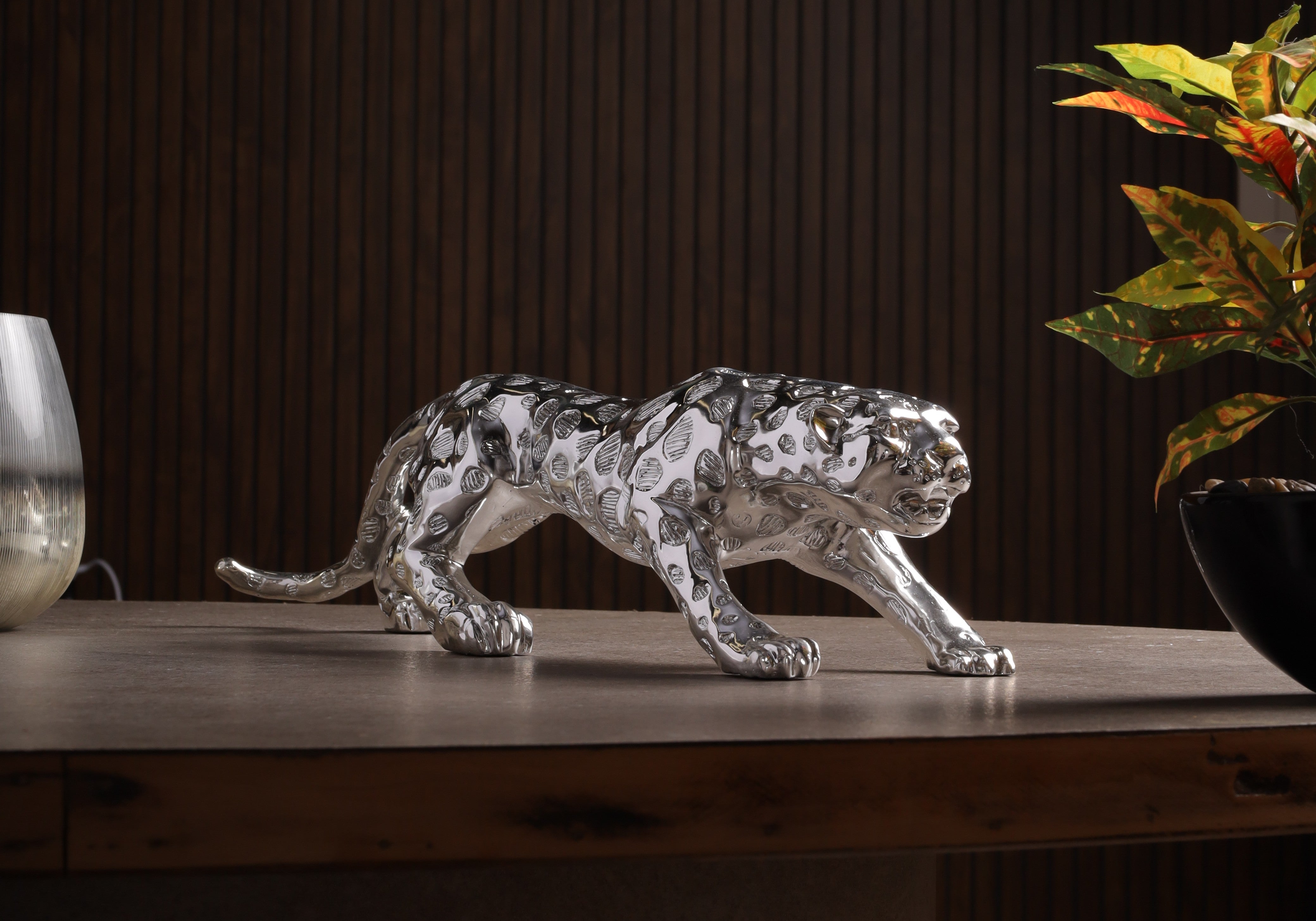 This sleek silver panther sculpture embodies grace, agility, and silent strength. Its poised stance and detailed craftsmanship make it a powerful statement piece for any modern space. Symbolizing confidence and determination, it adds a bold, luxurious touch to your decor. Perfect for those who appreciate elegance with an edge.
