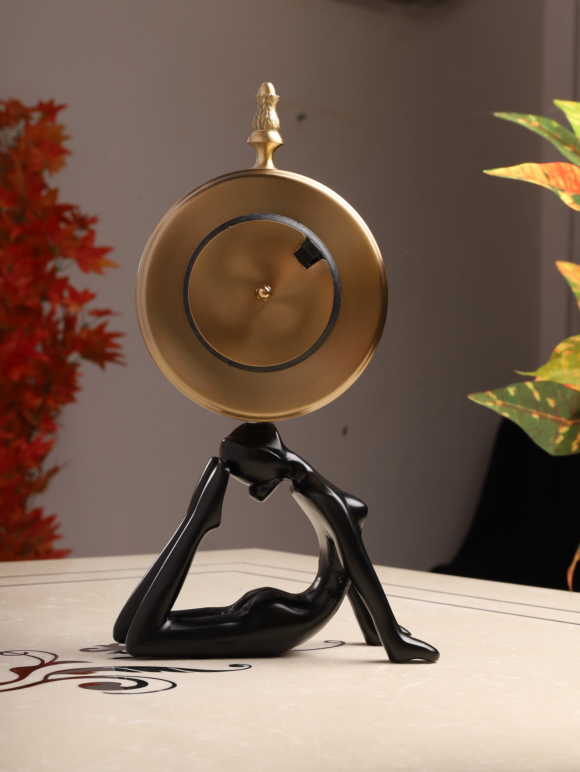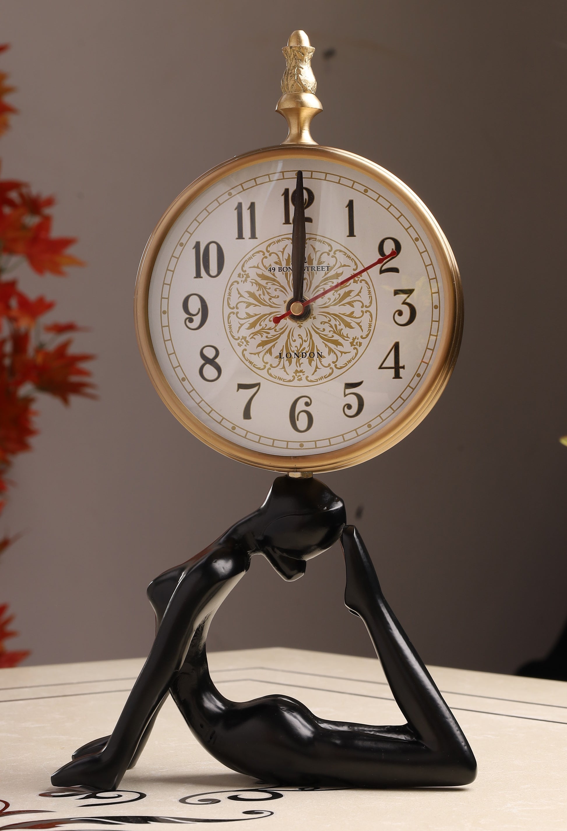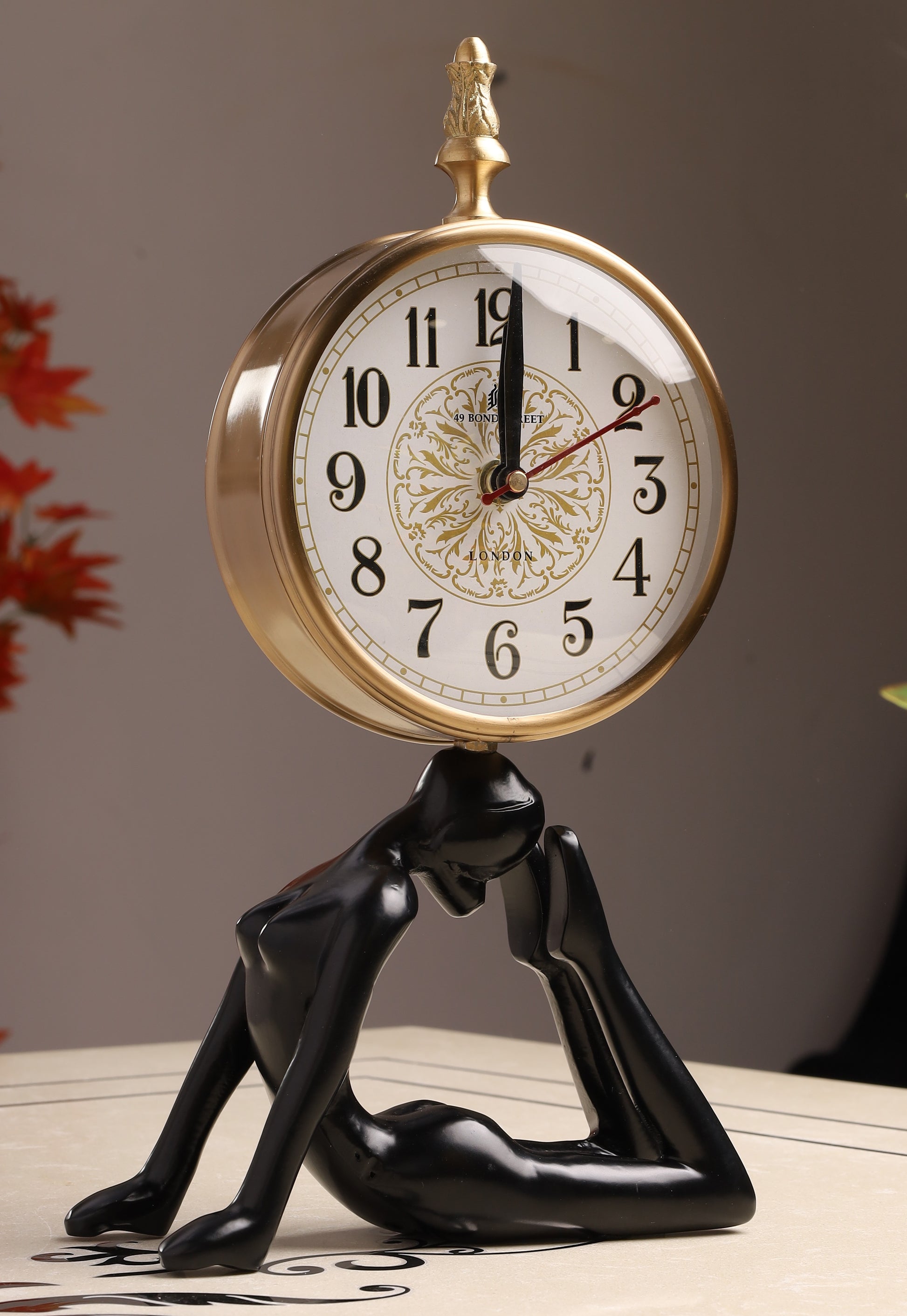 This exquisite table clock, perched upon a striking human-figure base, transcends mere timekeeping to become a sculptural statement. Its antique-inspired dial with intricate detailing, encased in a polished frame, offers a timeless elegance. A true embodiment of sophisticated design, it's a distinguished accent for any refined interior.