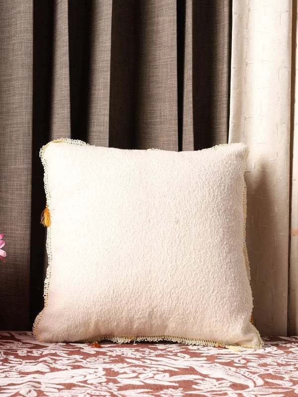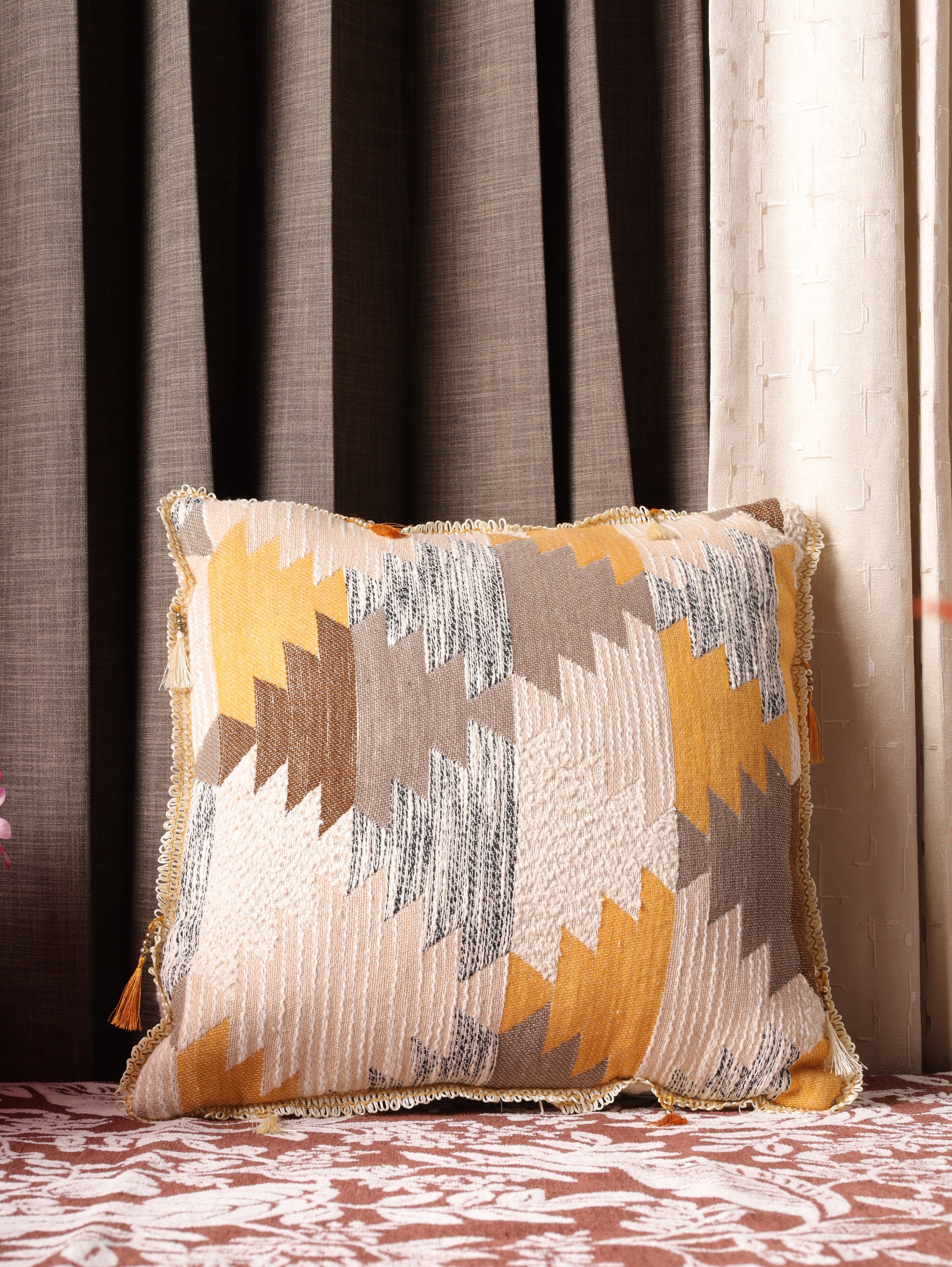 Introduce a vibrant charm to your space with the Boho Peaks Cushion Cover. Showcasing an eye-catching zigzag pattern in earthy tones of yellow, white, and brown, this piece brings a cozy, eclectic feel to any room. Its textured weave and tasseled edges add a playful, artisanal touch. Ideal for bohemian or rustic-inspired interiors.