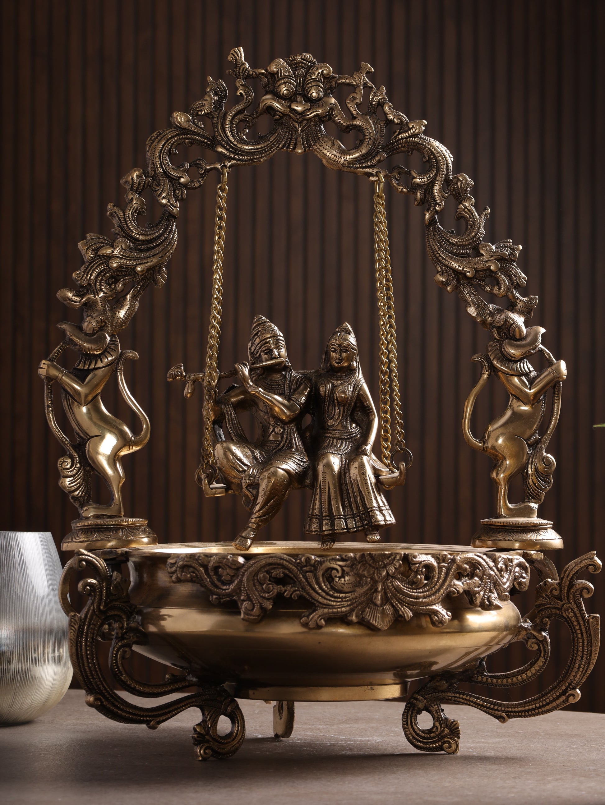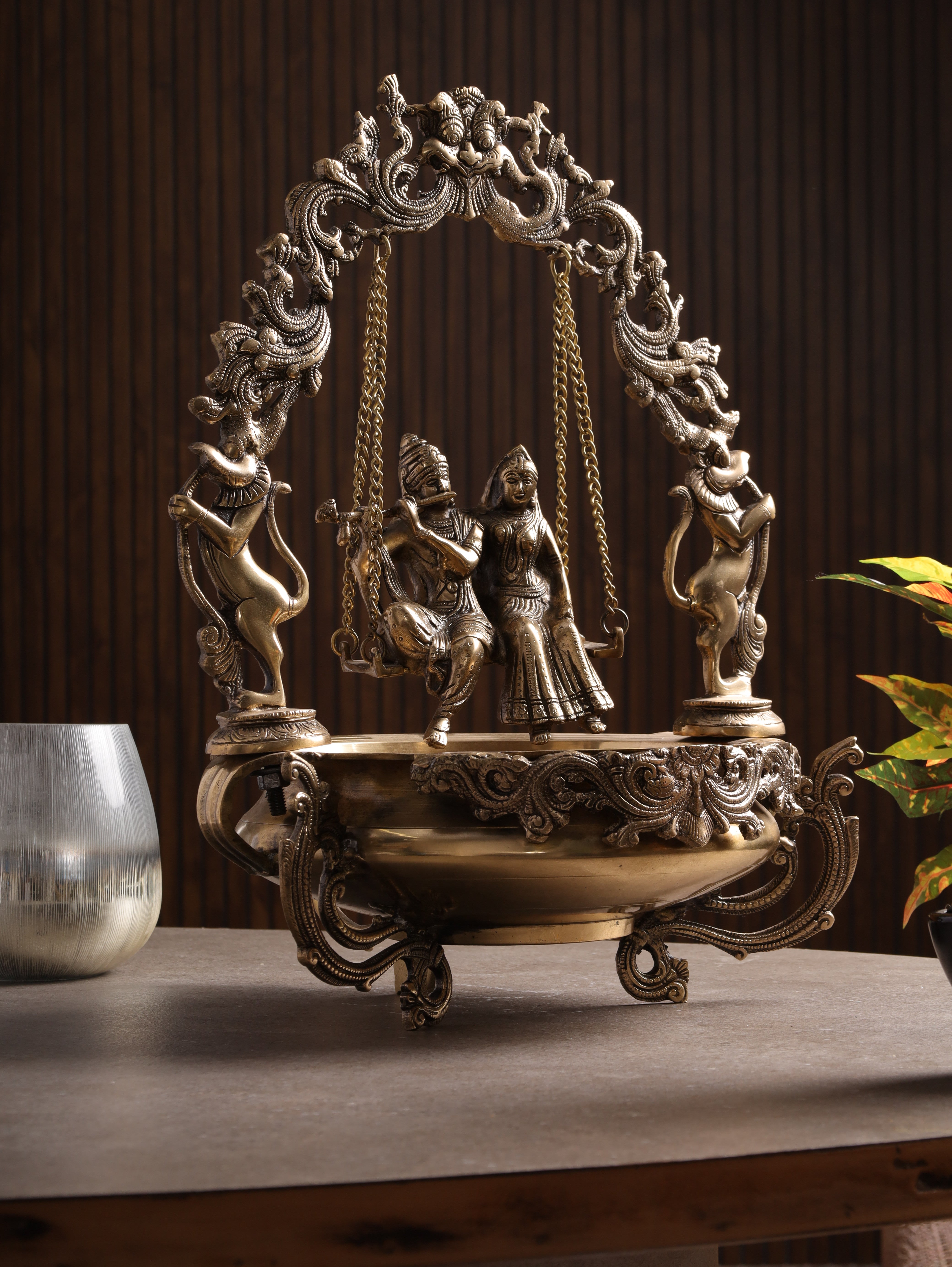 This exquisite brass idol showcases Lord Krishna and Radha seated on a decorative swing (jhula), beautifully framed with intricate arch designs and celestial motifs. Symbolizing divine love and harmony, the idol radiates spiritual serenity and aesthetic grandeur. The swinging element adds a dynamic charm, making it a stunning centerpiece for any home altar or living space. Ideal as a spiritual gift or festive décor piece.