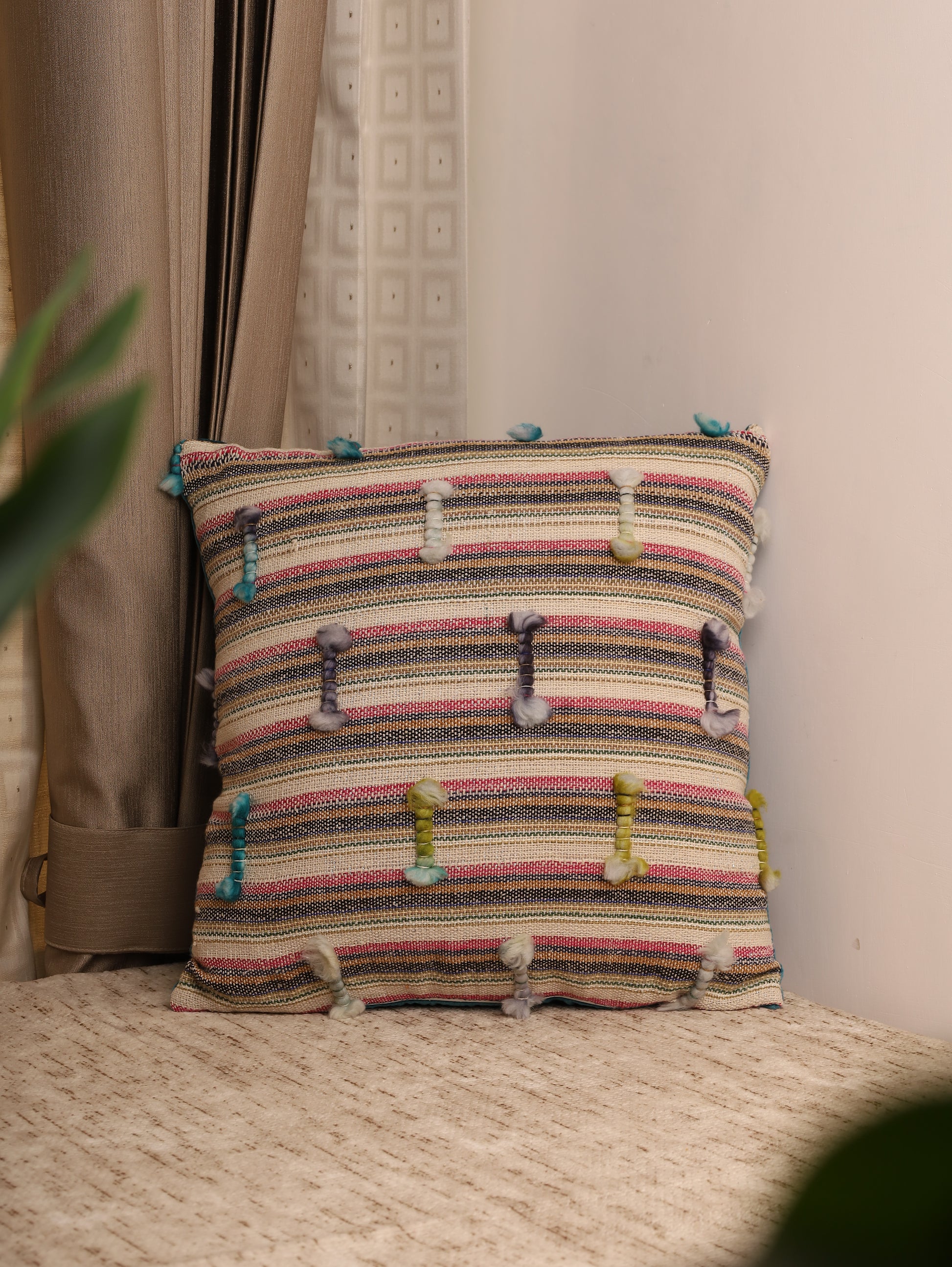 Add a playful touch to your interiors with the Candy Stripe Cushion Cove. This vibrant piece features multicolored horizontal stripes and textured knots for a fun and bohemian vibe. Handwoven for an artisanal feel, it’s perfect for adding warmth and personality to sofas, chairs, or beds. A unique accent for modern and eclectic spaces.