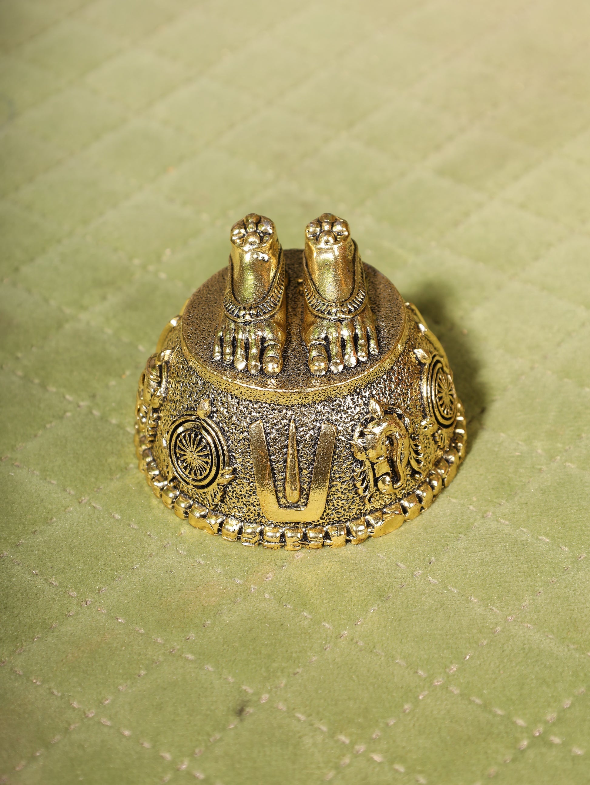 This ornate brass sculpture features the sacred padukas (footprints) of Goddess Lakshmi, symbolizing prosperity, purity, and spiritual grace. Adorned with intricate carvings of divine symbols like Shankha, Chakra, and Namam, it invites positive energy and abundance into your space. Ideal for pooja rooms or as a sacred gift, it brings home the essence of devotion and divine blessings.