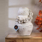 These handcrafted ceramic vases feature a rustic whitewashed finish with earthy brown undertones, giving them a charming, vintage appeal. Each vase is adorned with a bold ceramic chain detail, adding a sculptural and artistic touch. Their textured surface and organic shape create a warm, artisanal vibe. Perfect for farmhouse, boho, or contemporary interiors as statement décor pieces.