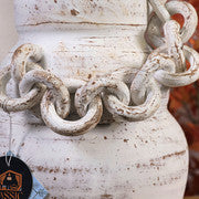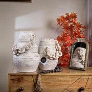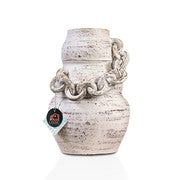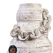 These handcrafted ceramic vases feature a rustic whitewashed finish with earthy brown undertones, giving them a charming, vintage appeal. Each vase is adorned with a bold ceramic chain detail, adding a sculptural and artistic touch. Their textured surface and organic shape create a warm, artisanal vibe. Perfect for farmhouse, boho, or contemporary interiors as statement décor pieces.