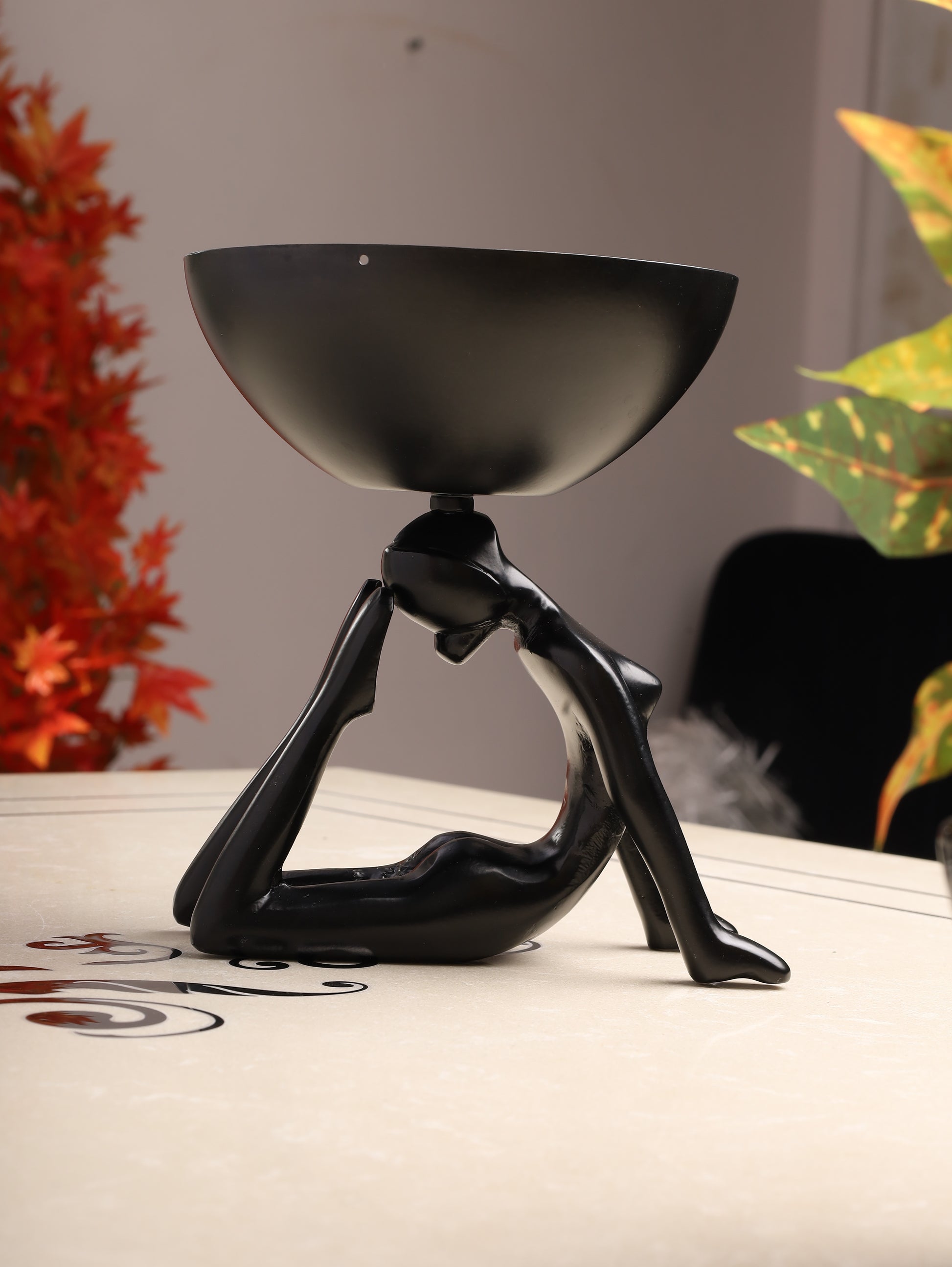 This stunning abstract showpiece showcases a poised female figure in matte black, elegantly balancing a wide bowl atop her shoulders. The modern artistic design brings sophistication and charm to any tabletop or shelf. Perfect as a centerpiece or functional decor item for candies, keys, or potpourri. A true blend of aesthetic beauty and practical elegance.