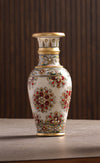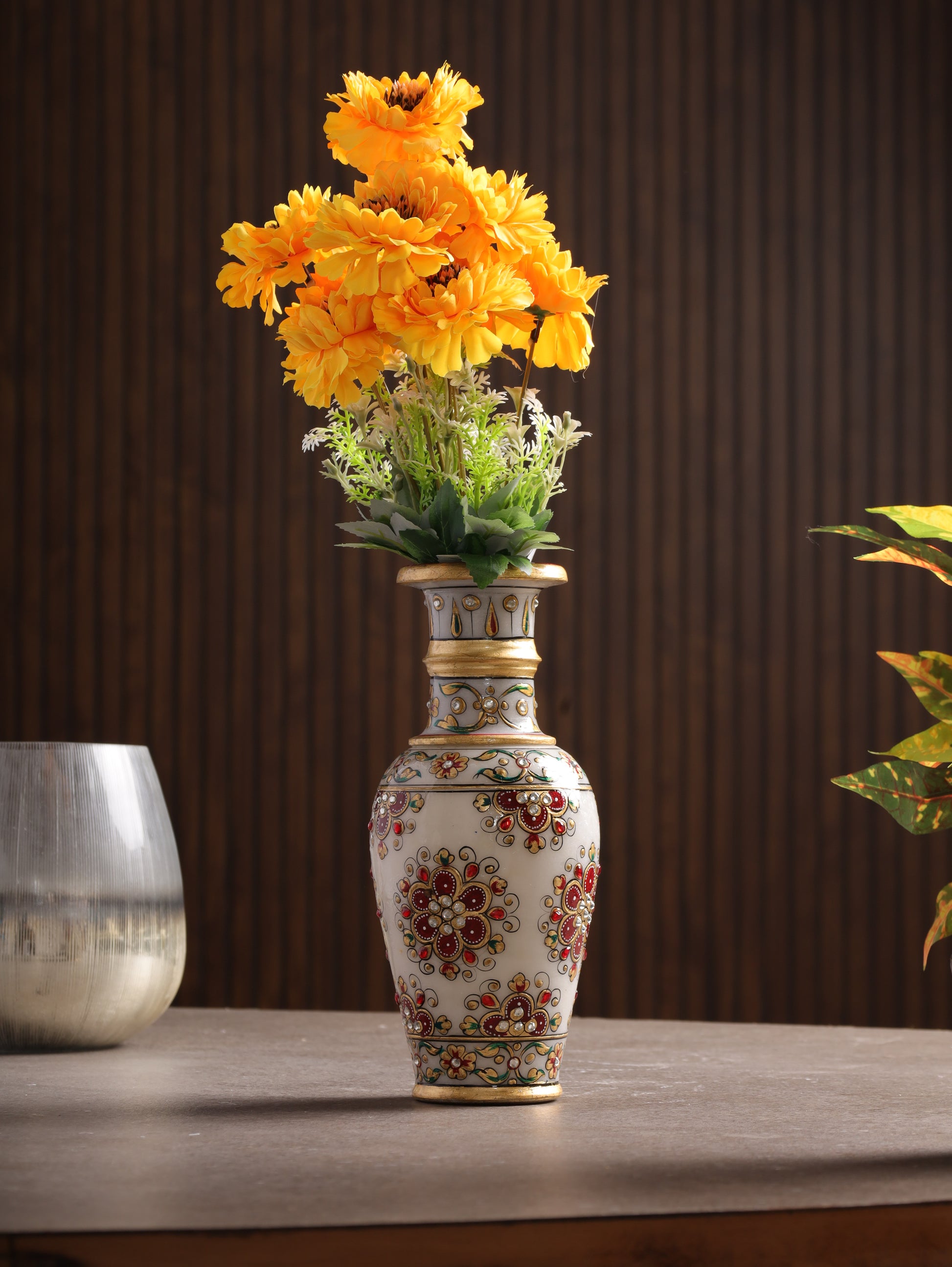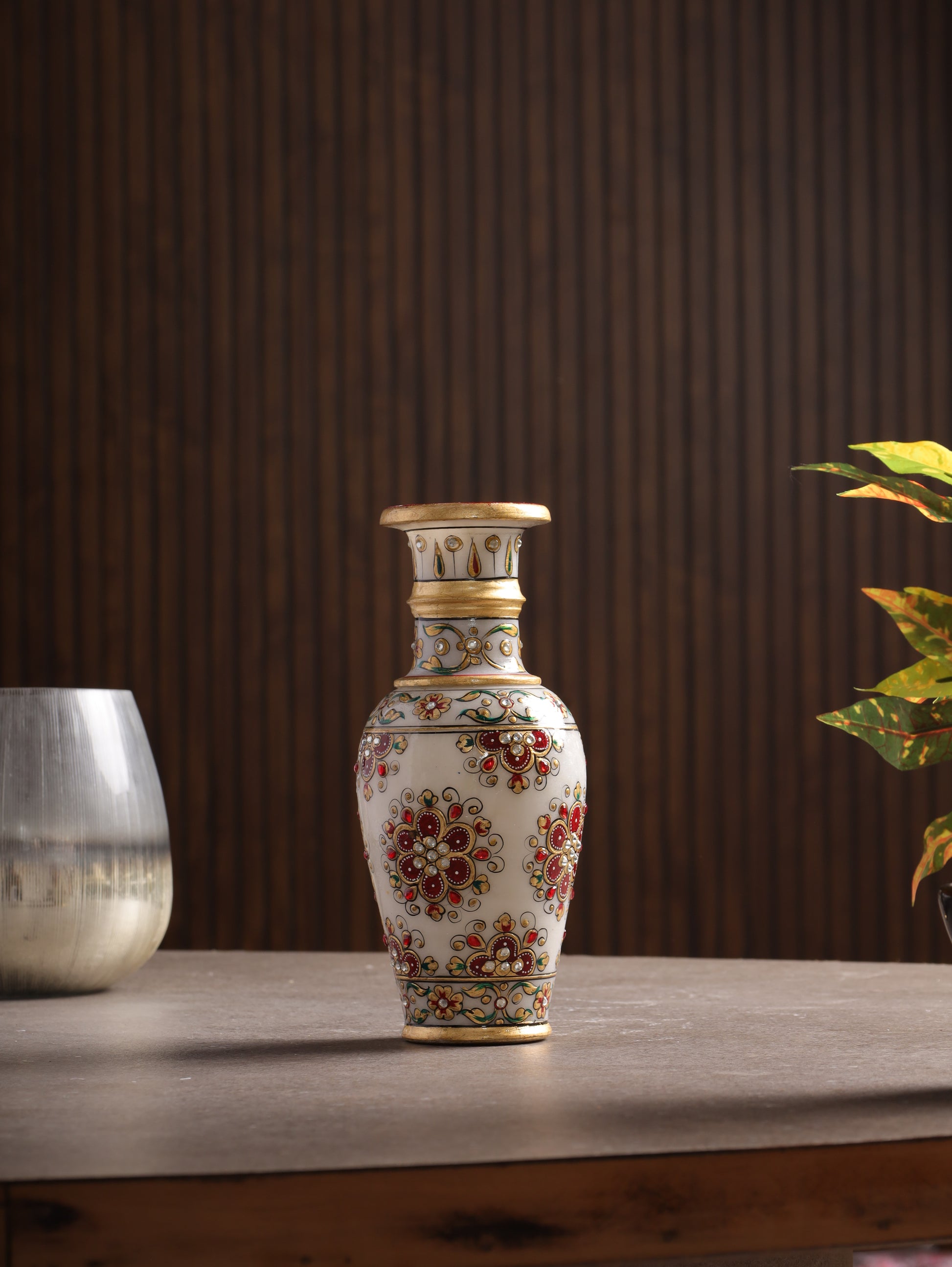 This handcrafted marble vase features a stunning hand-painted peacock, symbolizing grace and royalty. Embellished with delicate kundan work and traditional motifs, it radiates refined elegance. The pristine white marble base enhances its regal charm. A timeless décor piece for luxurious and cultural interiors.
