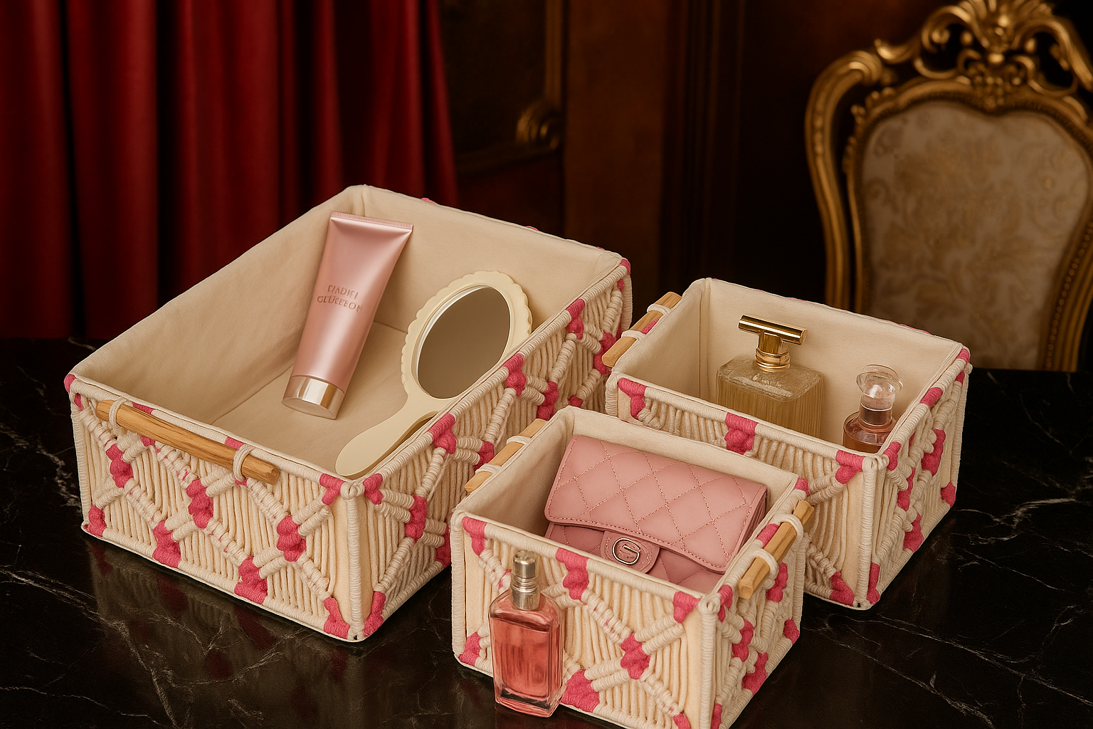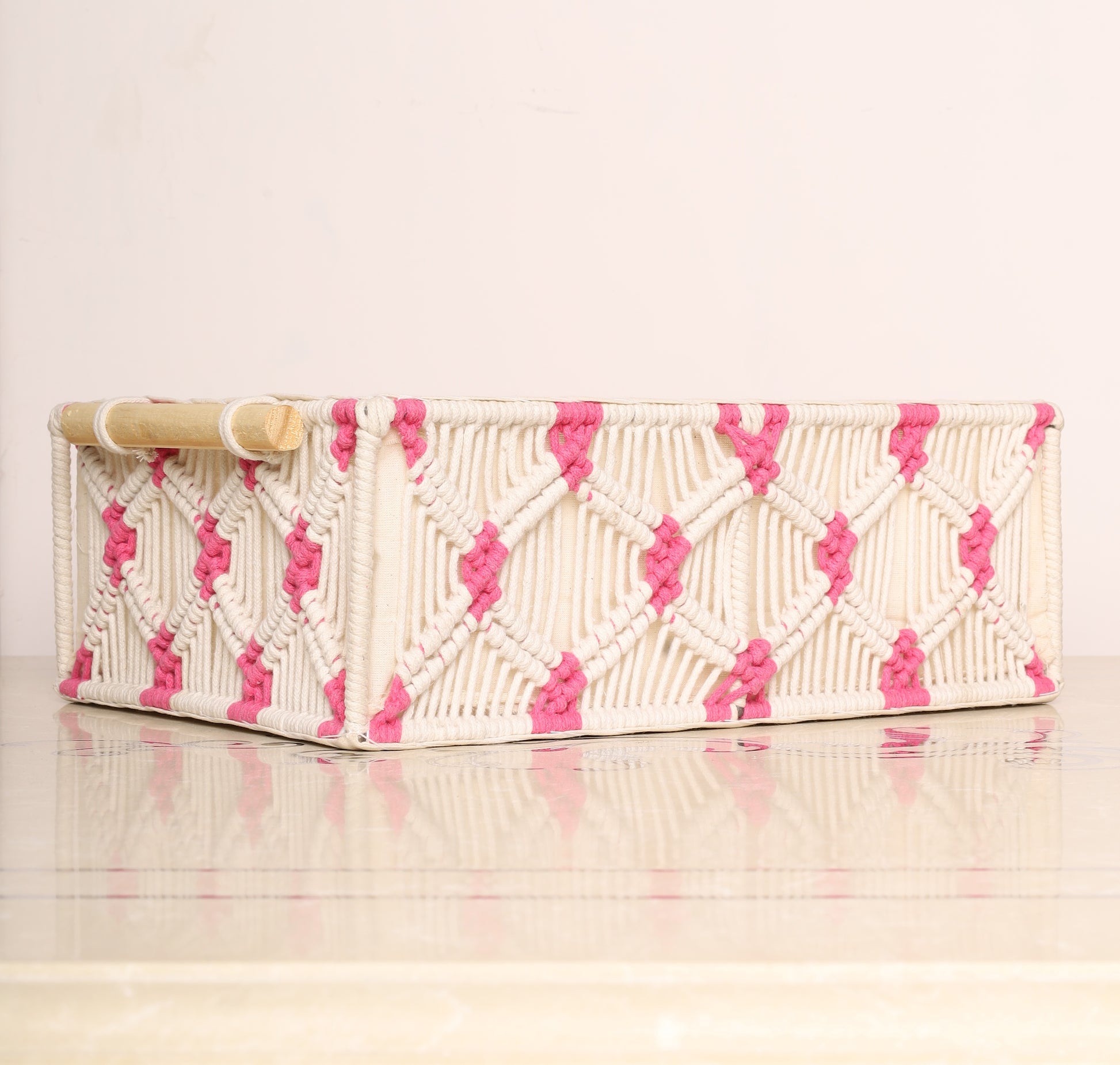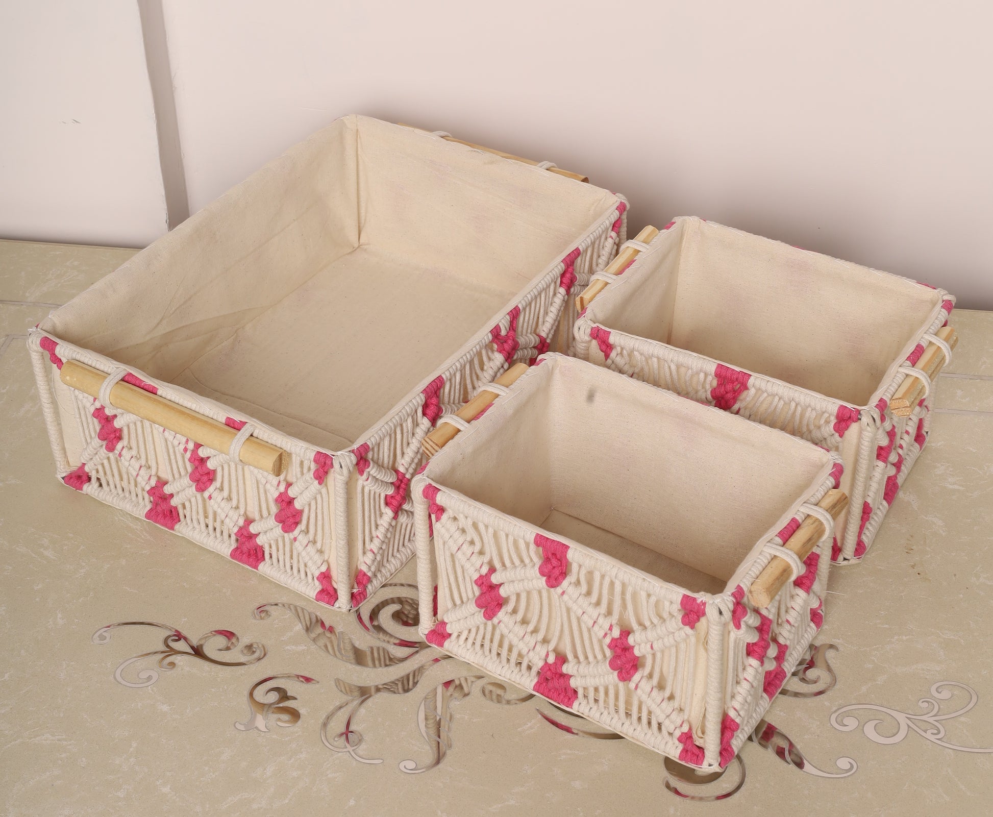 Brighten up your space with this charming set of handwoven macrame storage baskets. Adorned with red and cream detailing, these baskets offer a stylish yet functional solution for organizing your essentials. Each piece is crafted from durable materials with a soft inner lining for added protection. Perfect for use in living rooms, bathrooms, or kids’ rooms. Set includes three different sizes to suit your storage needs.