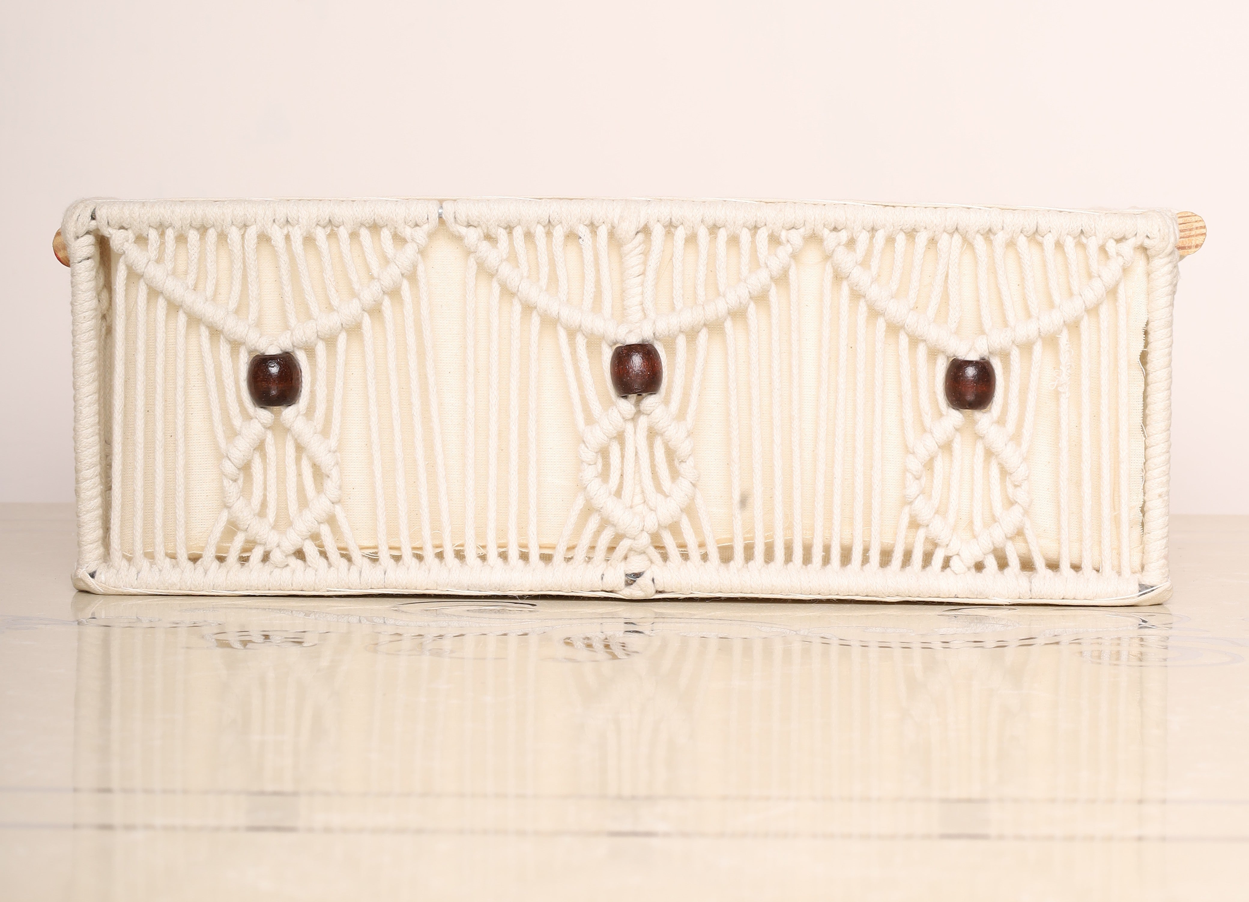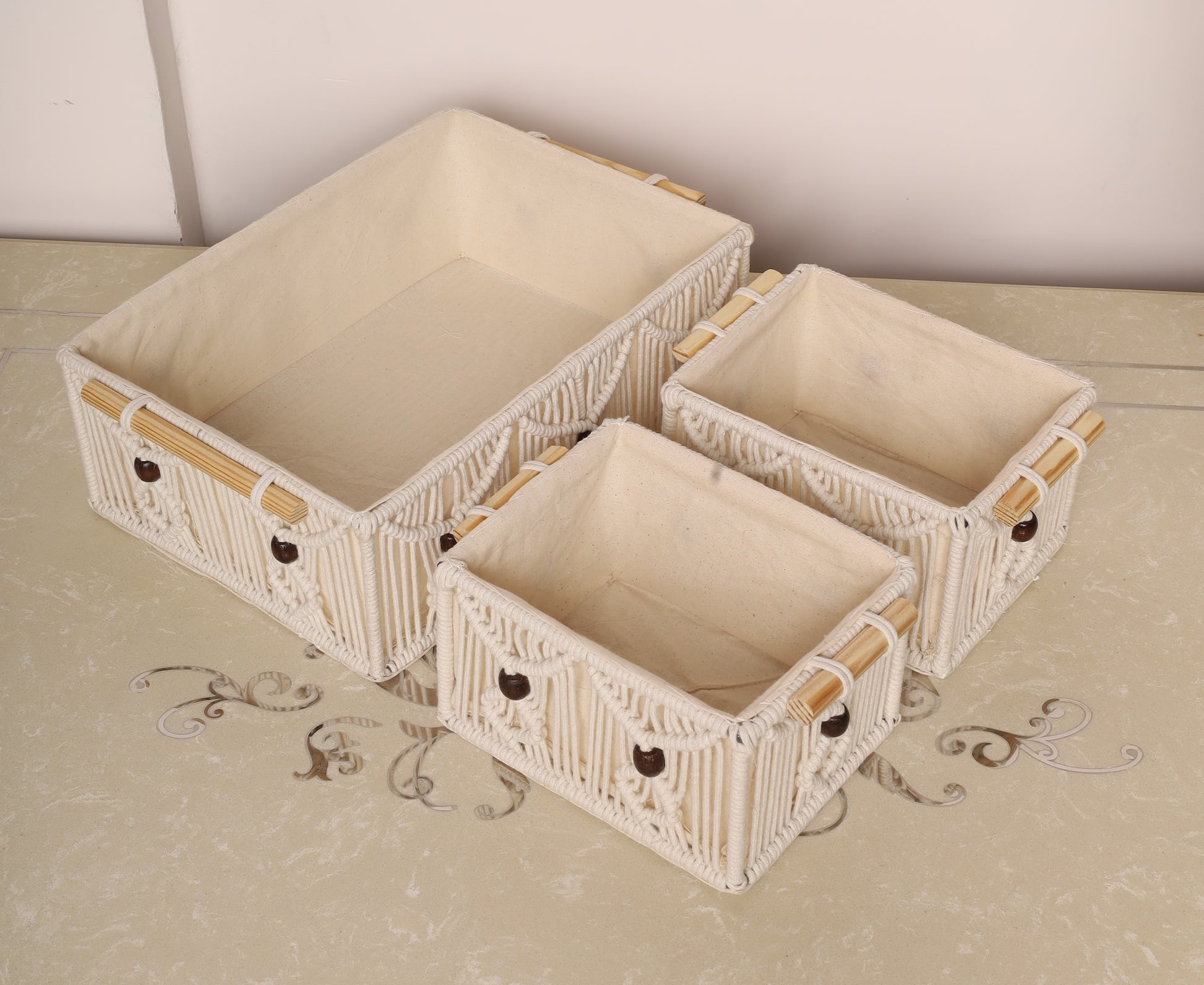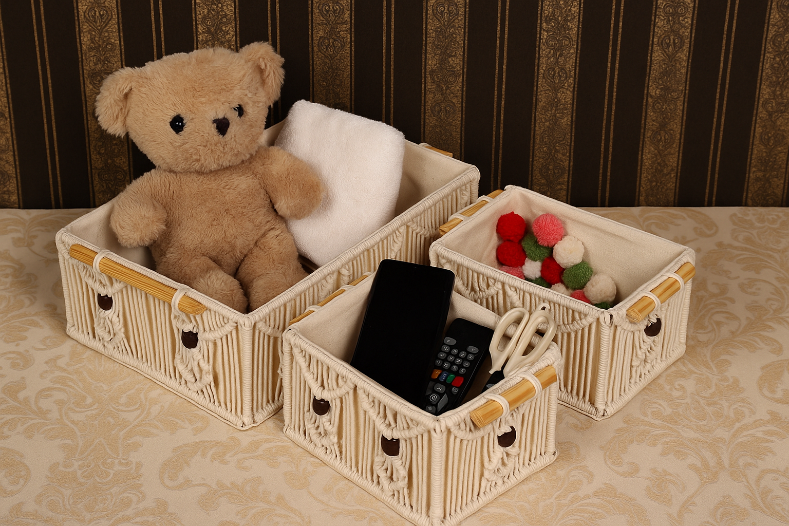 Add a touch of rustic charm to your space with these handcrafted macrame storage baskets. Featuring intricate knots and soft cotton lining, these baskets are ideal for organizing essentials while enhancing your décor. The neutral tones with subtle yellow accents complement any interior. Perfect for wardrobes, bathrooms, or living rooms.