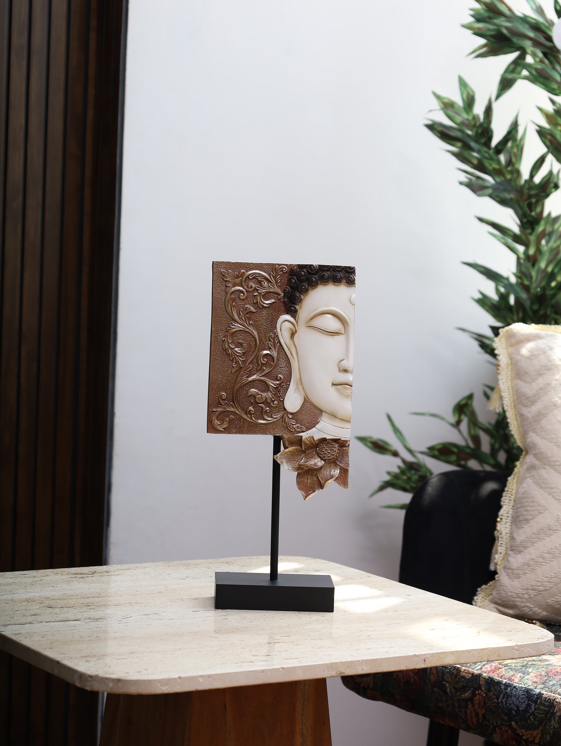 This image shows a beautifully crafted decorative piece featuring a serene half-face sculpture of Buddha. The left side of the sculpture depicts Buddha’s calm, closed-eye expression in a soft ivory tone, while the right side has ornate floral patterns in a textured bronze finish. It is mounted on a black stand.