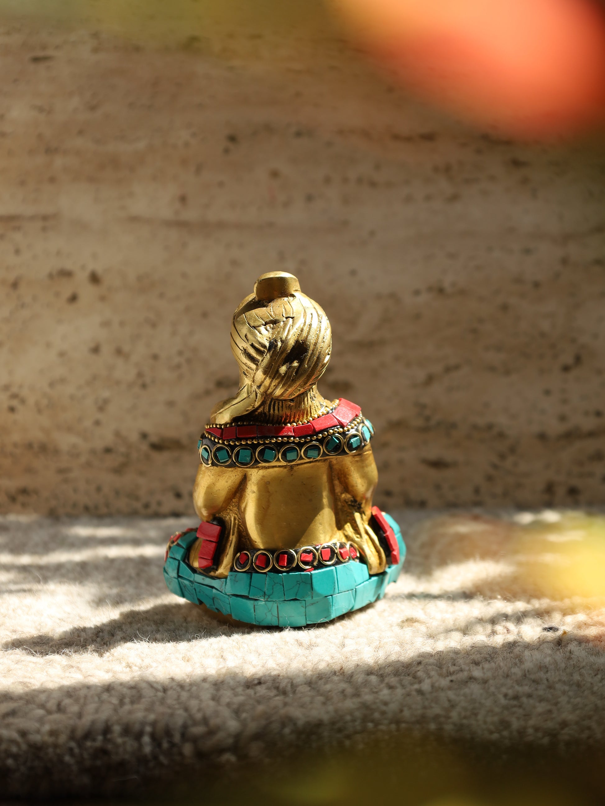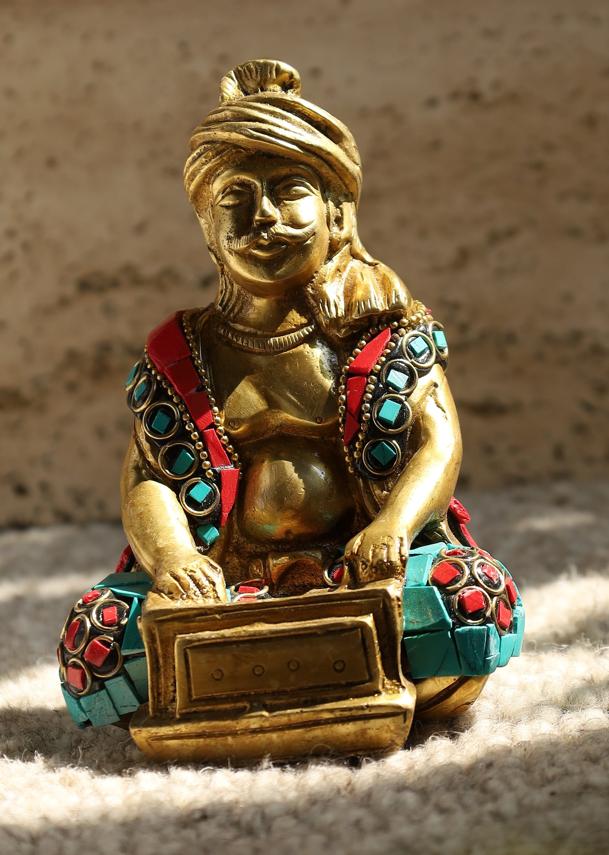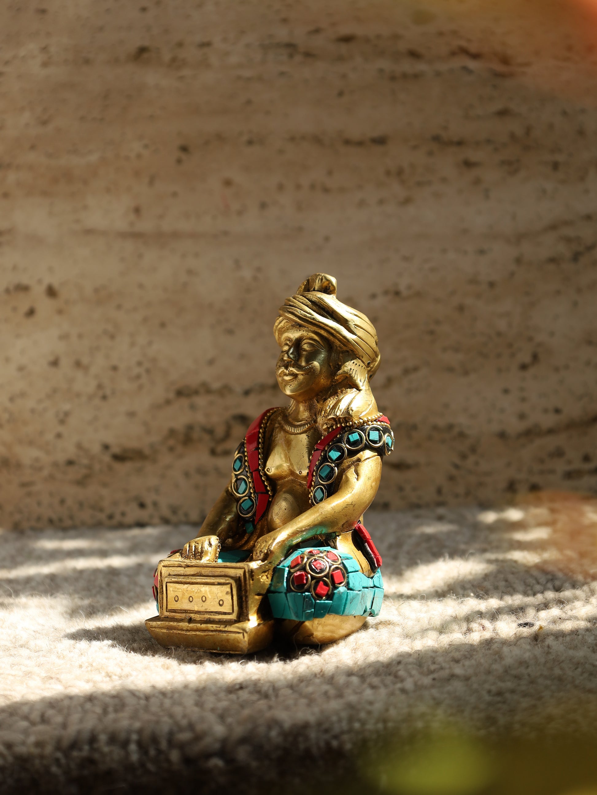 This is a decorative brass statue of a traditional Indian figure, adorned in colorful red, turquoise, and gold accents. The figure is seated with a calm expression, playing a traditional instrument, possibly a harmonium. It is wrapped in transparent plastic, likely for protection or packaging. The intricate detailing on the attire and accessories adds a vibrant and artistic touch to the piece.