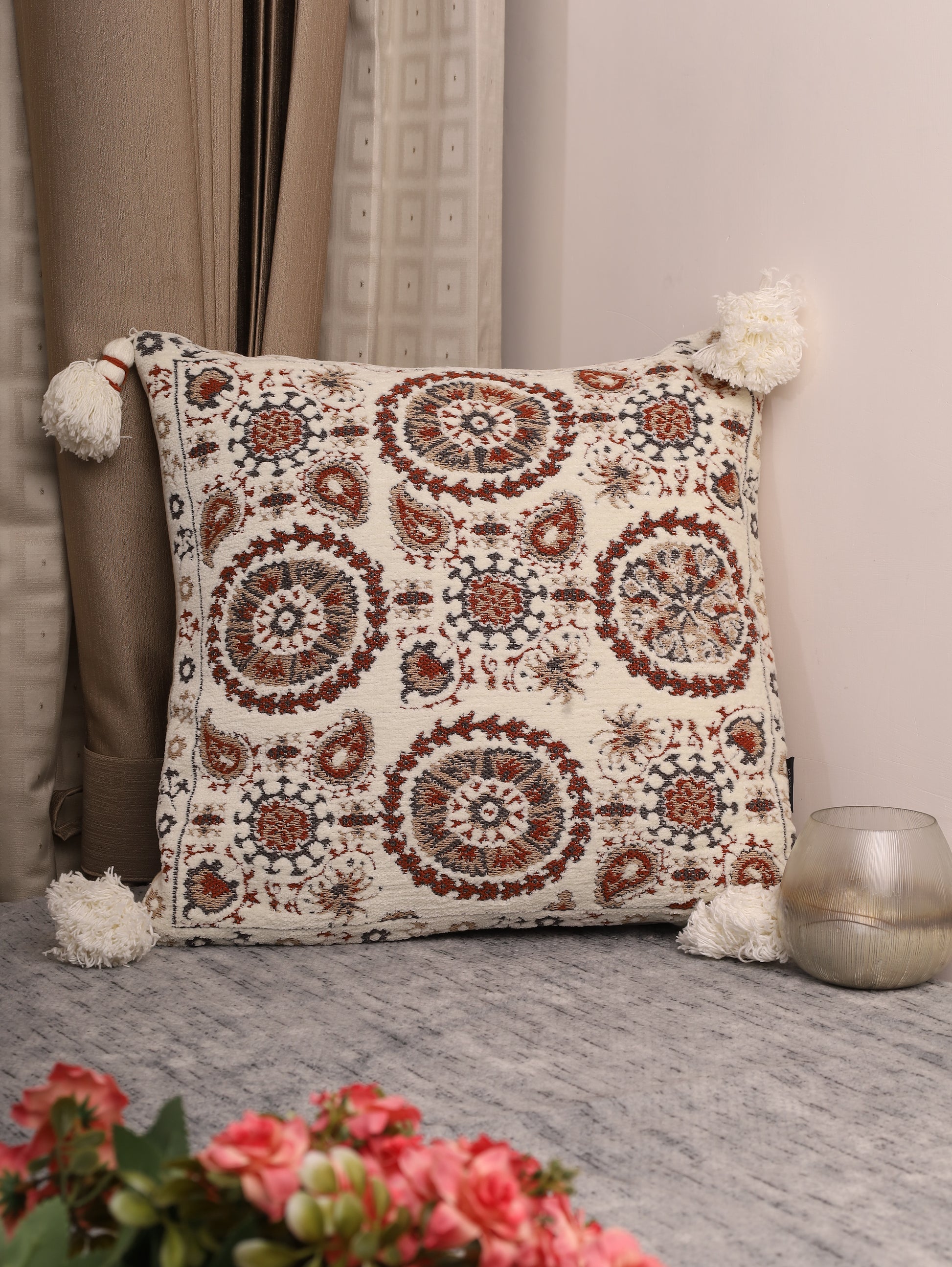 Bring home a touch of traditional artistry with this Intricate Mandala Cushion Cover. Featuring rich tones of rust, gold, and navy in detailed circular and paisley patterns, it adds warmth and sophistication to any space. The textured embroidery on a neutral base enhances its handcrafted appeal. Perfect for classic, bohemian, or ethnic-inspired interiors.