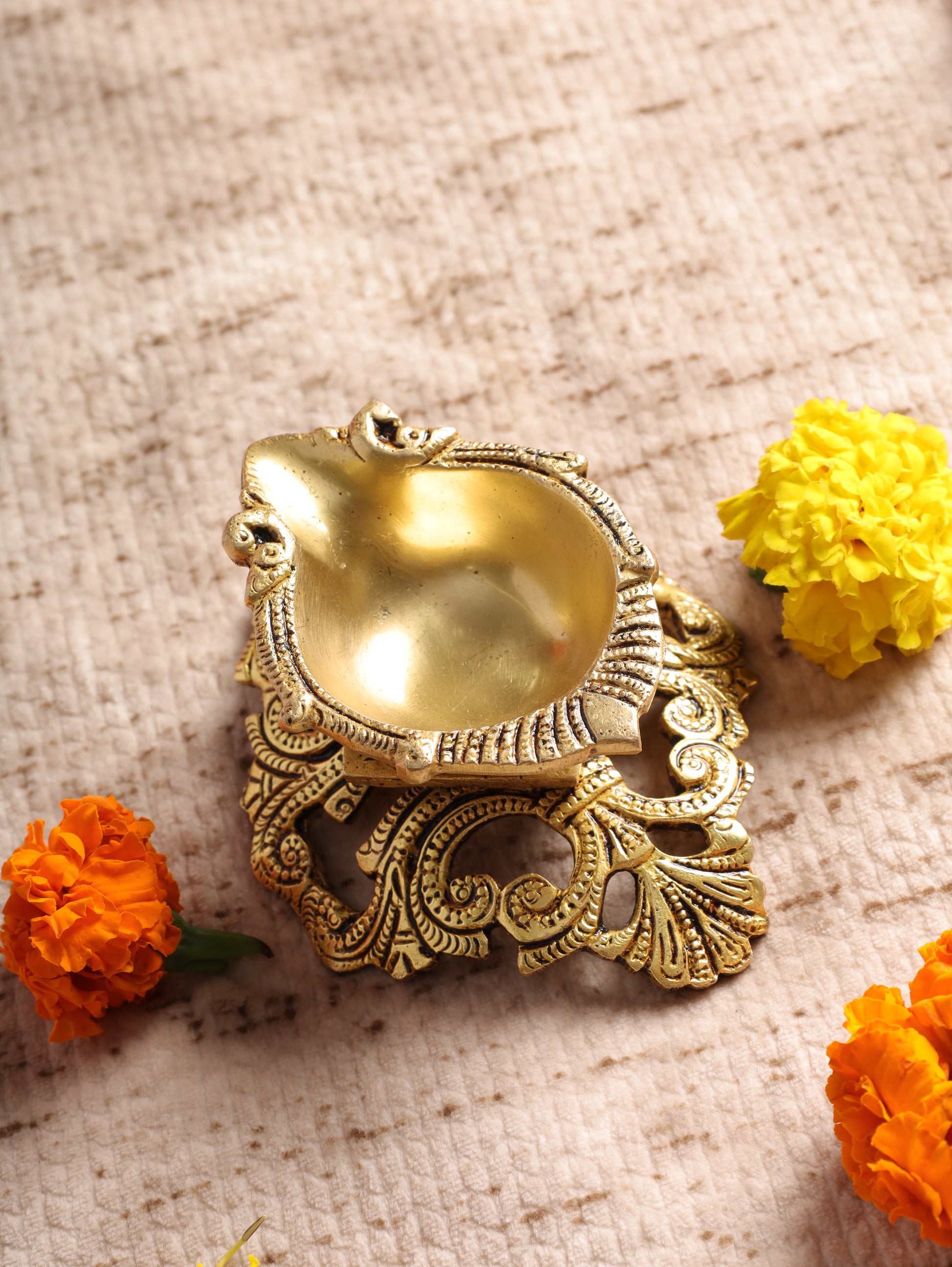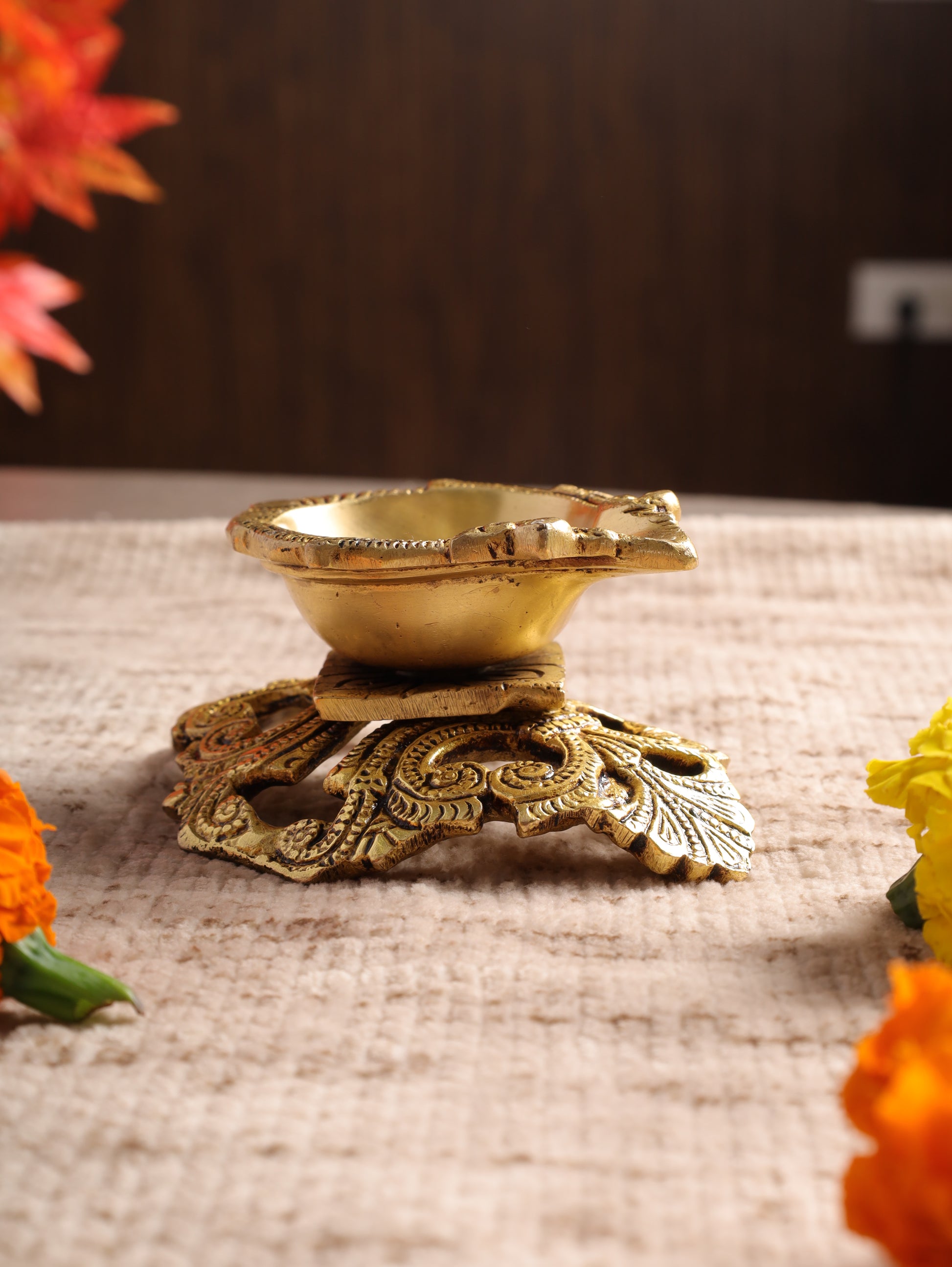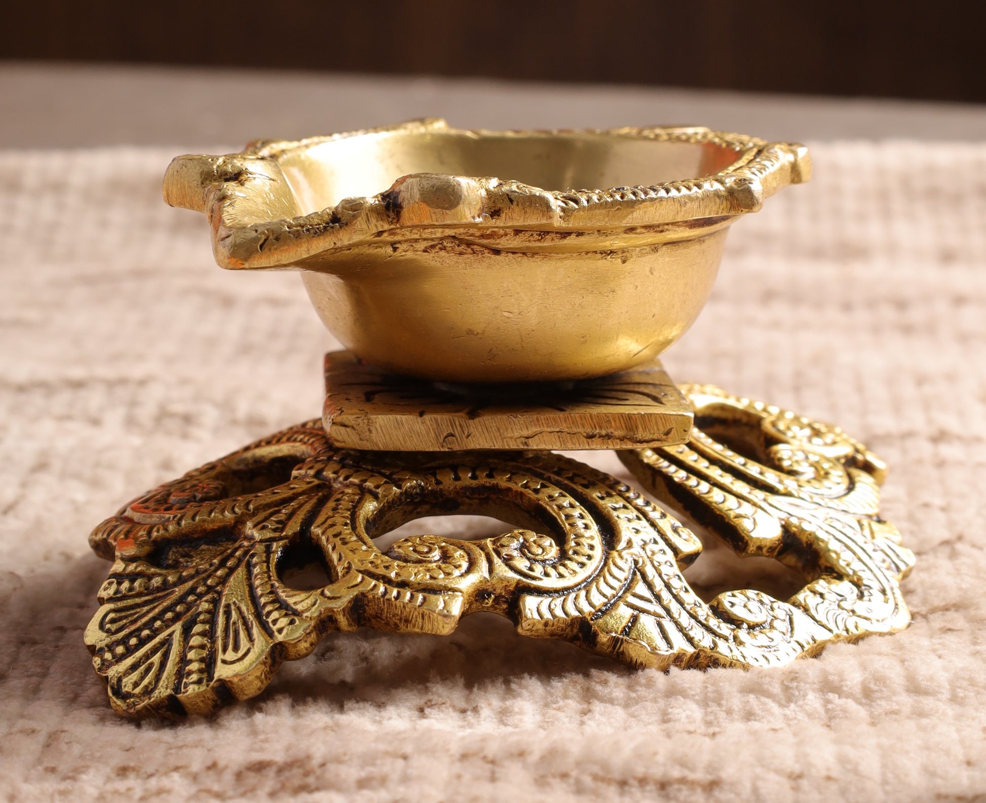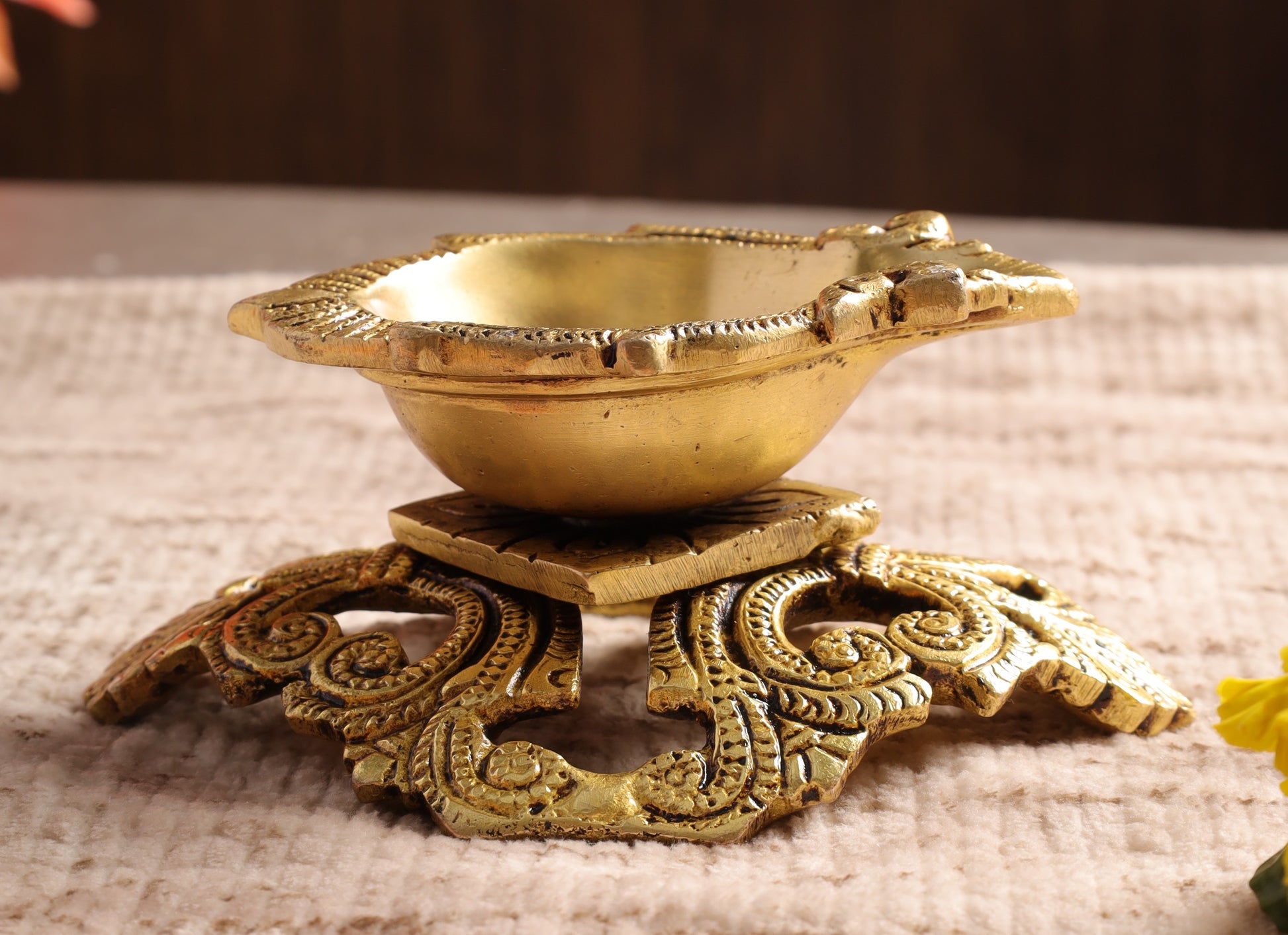 This handcrafted diya features a beautifully detailed leaf-patterned base, symbolizing prosperity and auspicious beginnings. Made of solid brass, it adds a traditional yet regal touch to your festive or spiritual setup. The wide bowl ensures a steady flame, ideal for long hours of pooja or celebration. A perfect blend of elegance and devotion.
