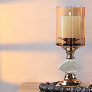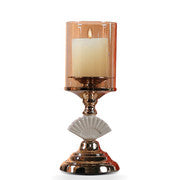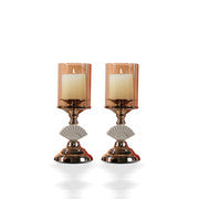 Add a regal touch to your interiors with the Royal Crest Candle Holder set. Featuring a gleaming metallic base with elegant fan-shaped detailing, this duo combines classic artistry with modern sophistication. The amber glass cover casts a soft, ambient glow, creating a cozy and inviting atmosphere. Perfect for living rooms, dining spaces, or festive décor, these candle holders exude timeless charm and luxury.
