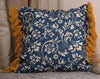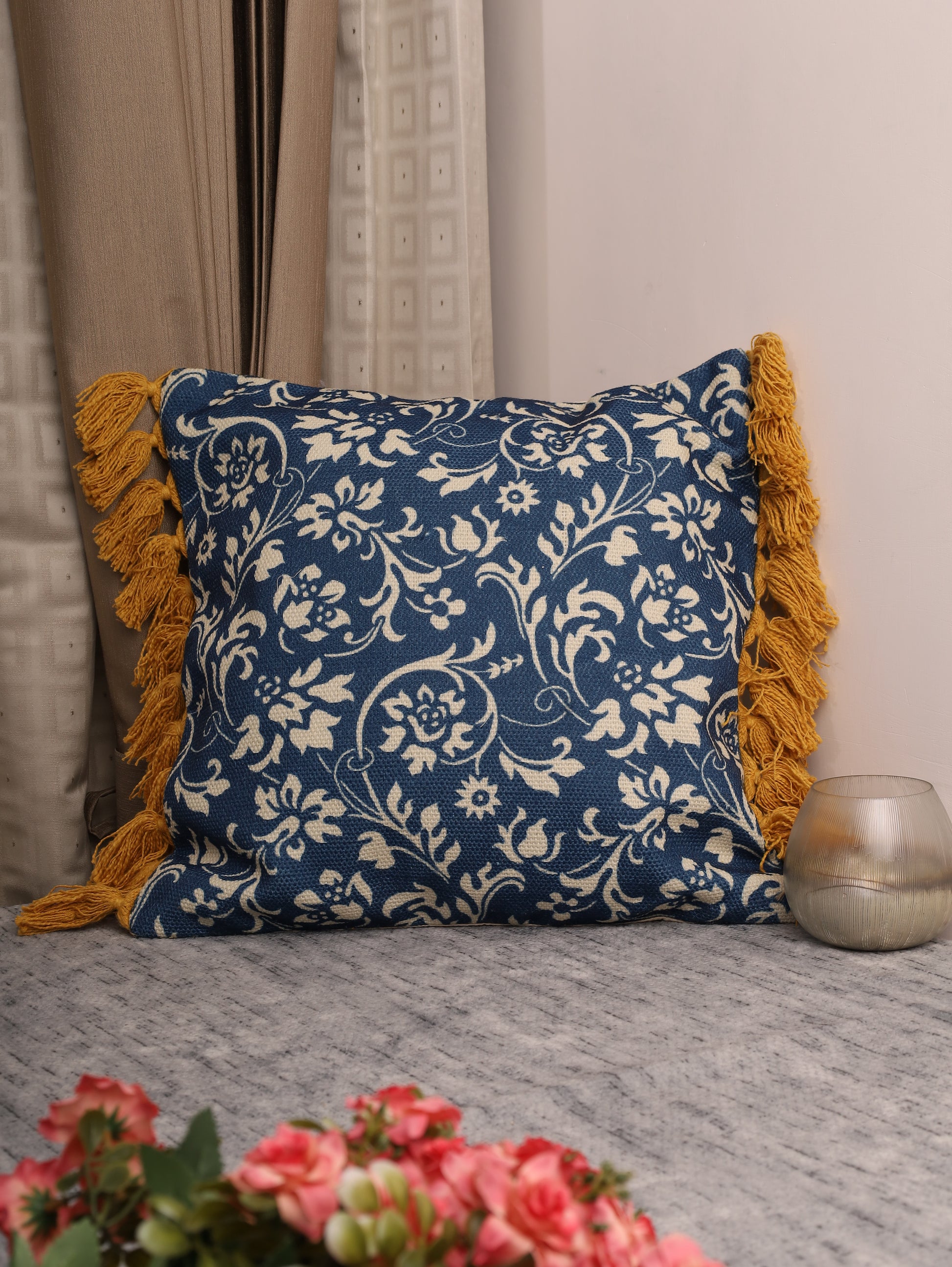 This navy blue cushion cover is a stunning blend of floral patterns and regal golden accents. The bold yellow tassels on the sides add a dramatic and stylish flair. Ideal for livening up your sofa or lounge area with a luxurious touch.