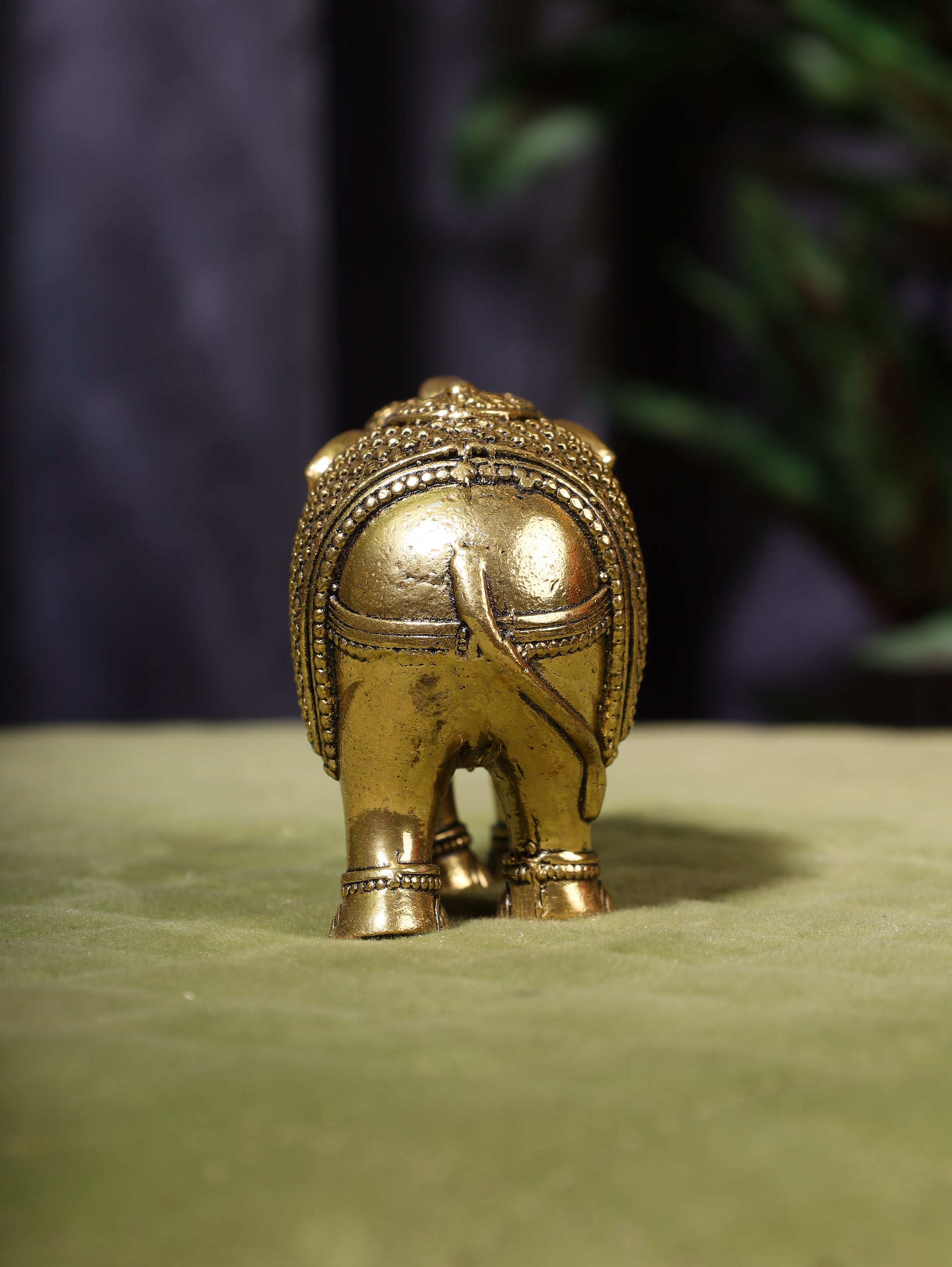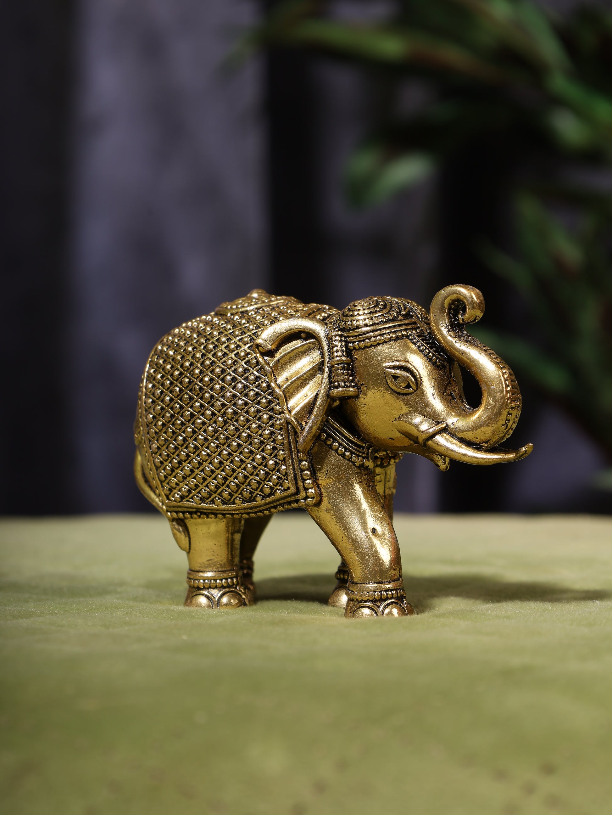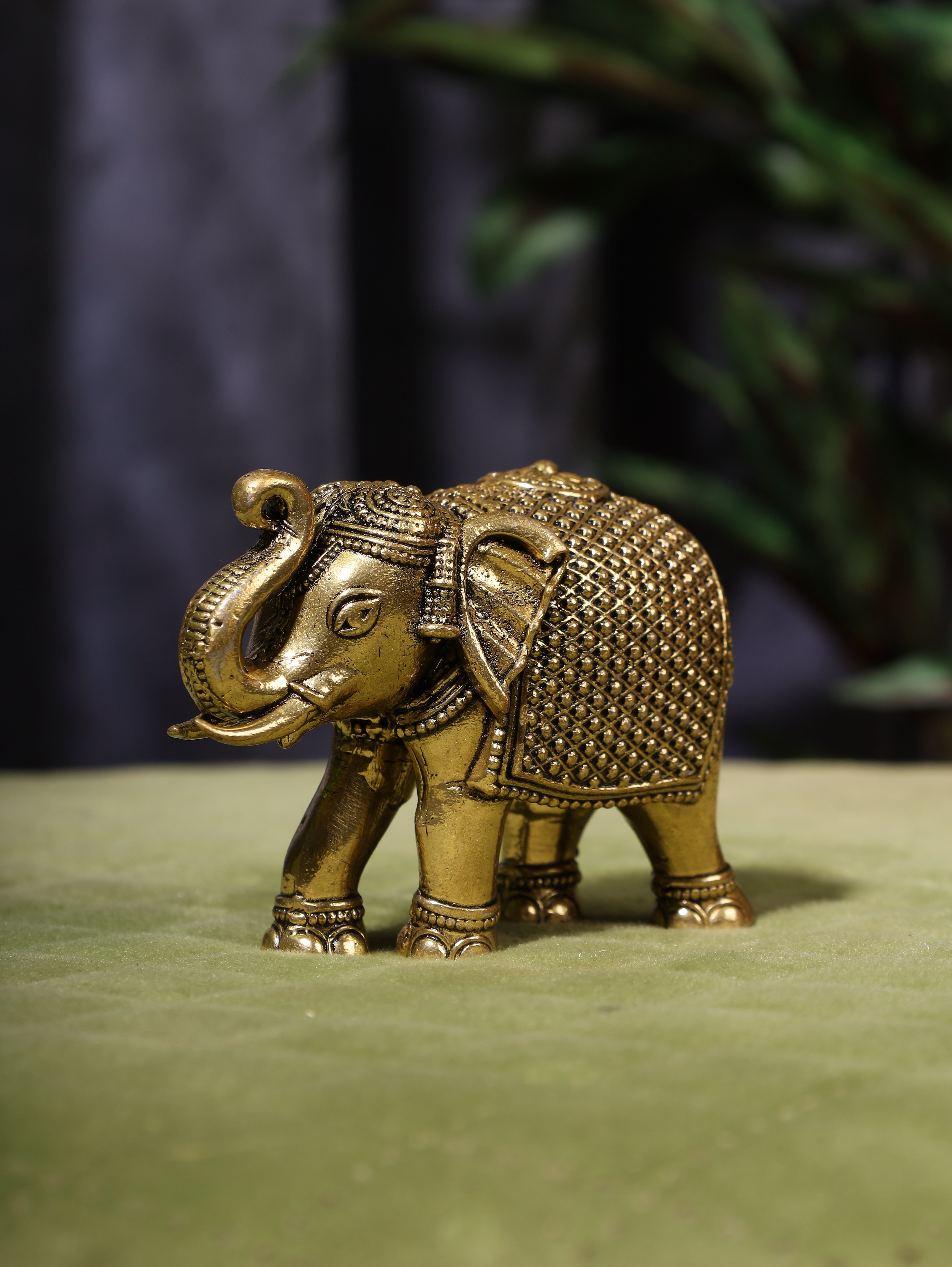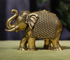 This is a decorative elephant figurine made of metallic material, likely brass or a brass-like alloy. The elephant is ornately adorned with a patterned blanket and intricate headgear, signifying cultural or ceremonial importance. The craftsmanship indicates traditional Indian or Southeast Asian design influences.