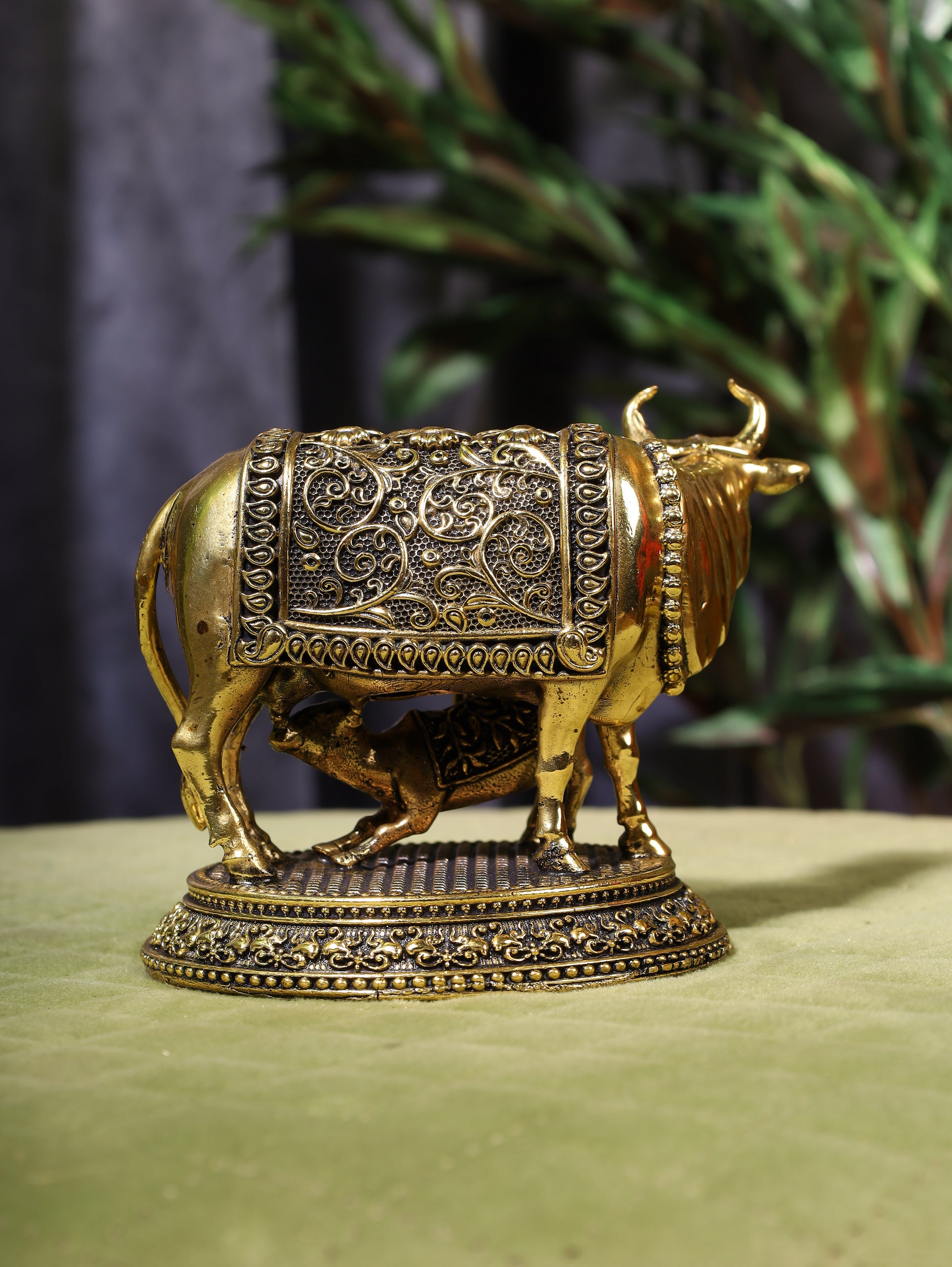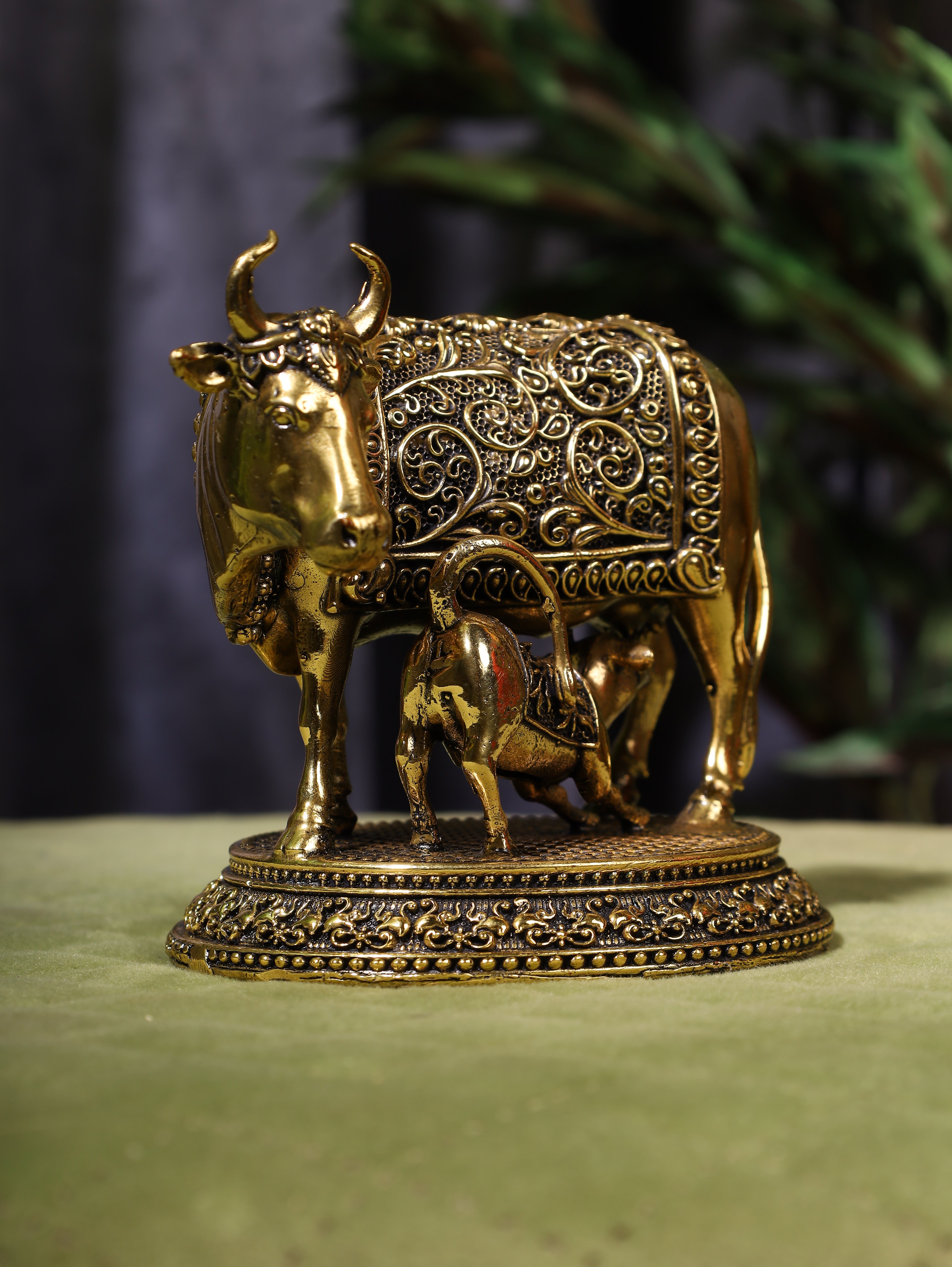 This image shows a decorative brass figurine of a cow and a calf. The cow is adorned with intricate, ornate carvings and a decorative blanket design, often symbolic in Indian culture. The calf is depicted in a suckling posture under the cow, emphasizing nurturing and maternal care. The piece rests on a detailed round base.
