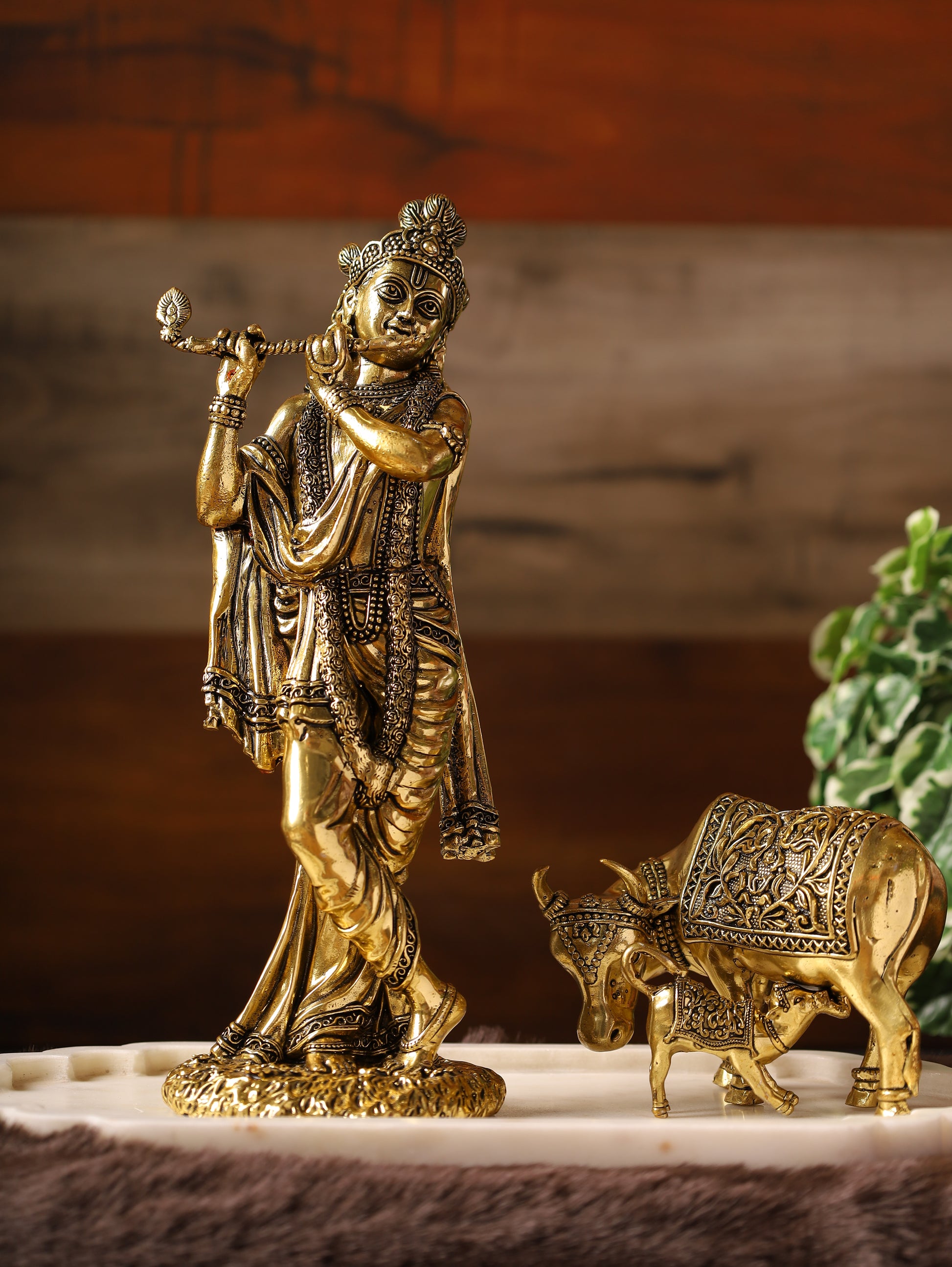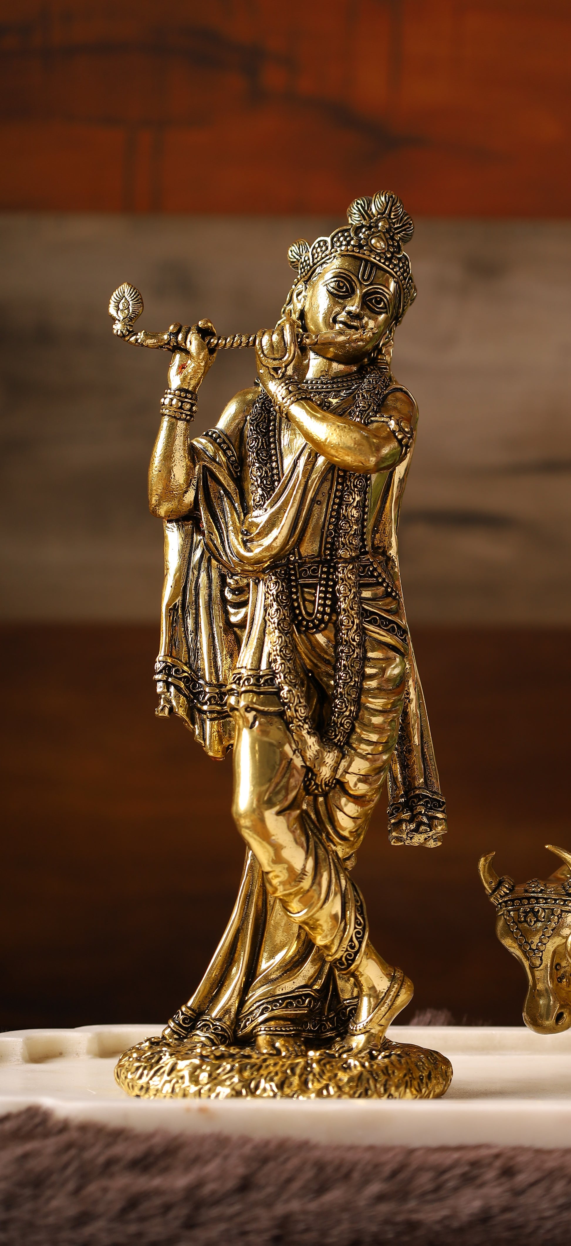 Add divine elegance to your space with this Superfine Brass Krishna Idol Standing on a Rock. Depicting Lord Krishna in a serene flute-playing pose, this handcrafted piece showcases exquisite detailing and a rich antique finish. Symbolizing love and devotion, it’s perfect for home altars, meditation corners, or as a thoughtful spiritual gift. A timeless décor element that radiates peace and grace.