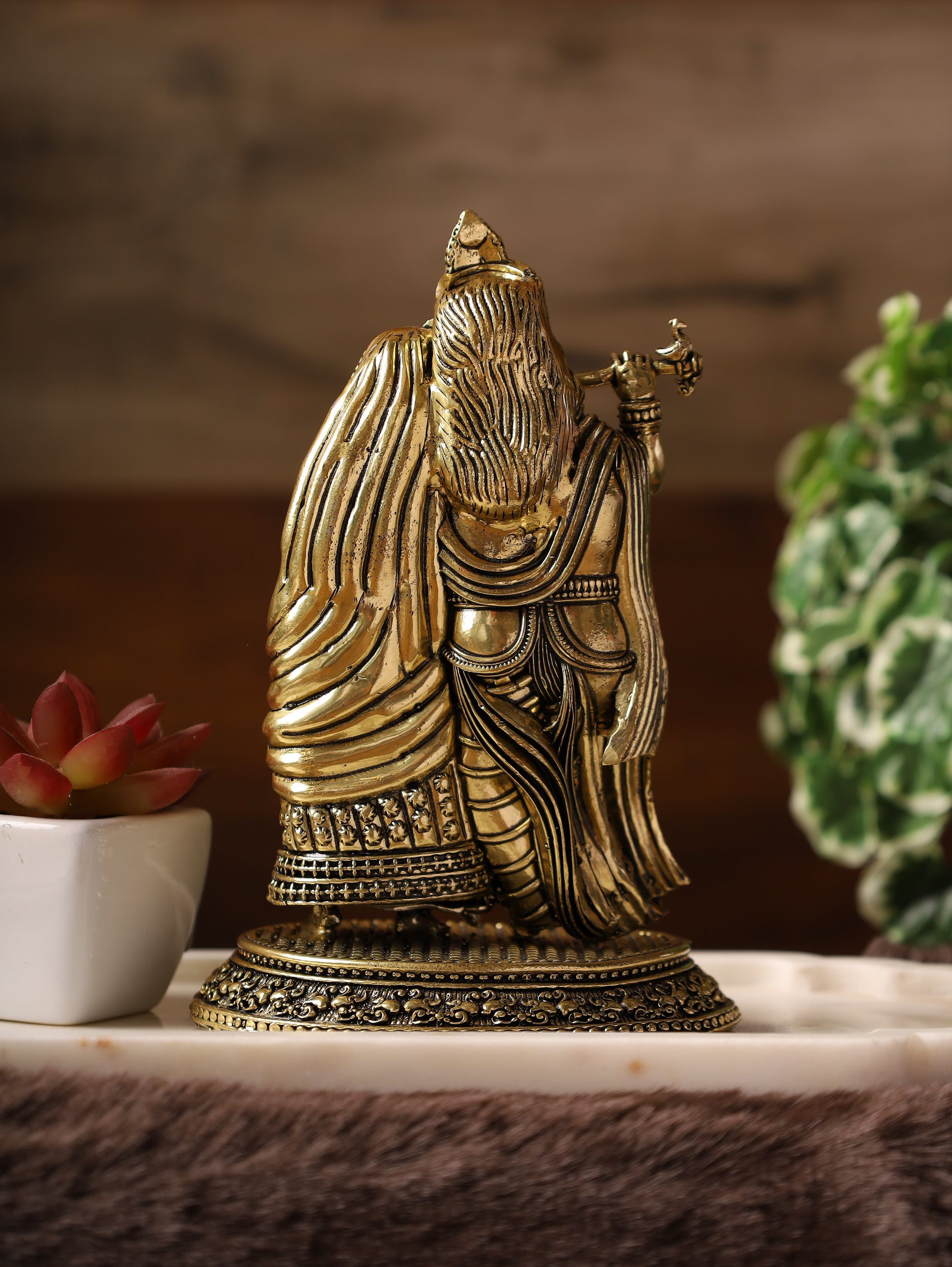Bring divine charm to your space with this exquisite Superfine Brass Radha Krishna Idol. Intricately handcrafted, it captures Lord Krishna playing the flute with Radha lovingly resting beside him, symbolizing eternal love and harmony. The detailed craftsmanship and antique brass finish make it a perfect piece for home décor or a spiritual gift. Ideal for pooja rooms, living spaces, or festive occasions.