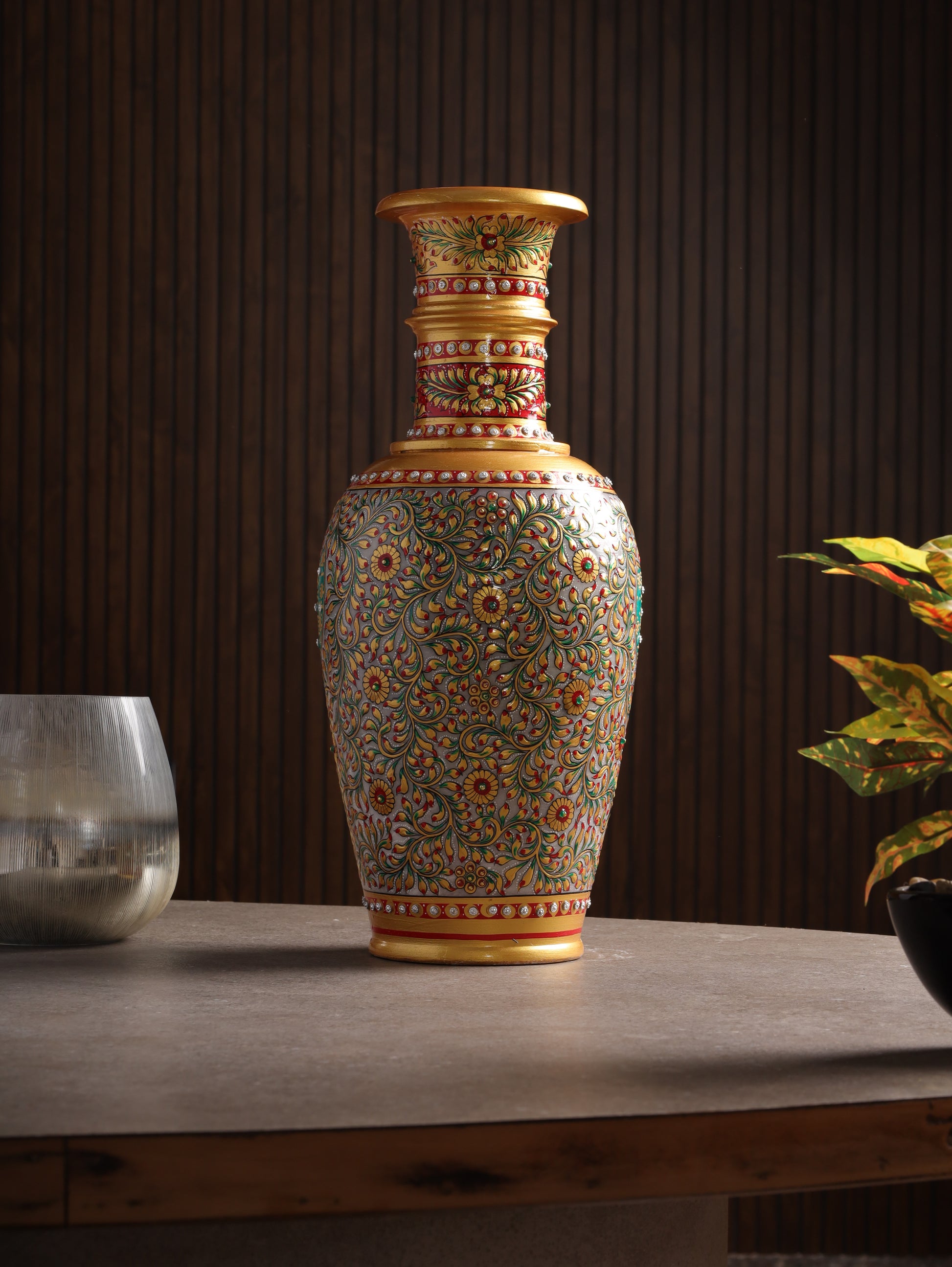 Celebrate regal beauty with this opulent handcrafted marble vase, adorned with a stunning engraved royal woman motif. Rich enamel detailing, embedded stones, and fine gold accents evoke the grandeur of palace art. A masterpiece of traditional craftsmanship and timeless grace. Ideal for luxury interiors that speak heritage and class.