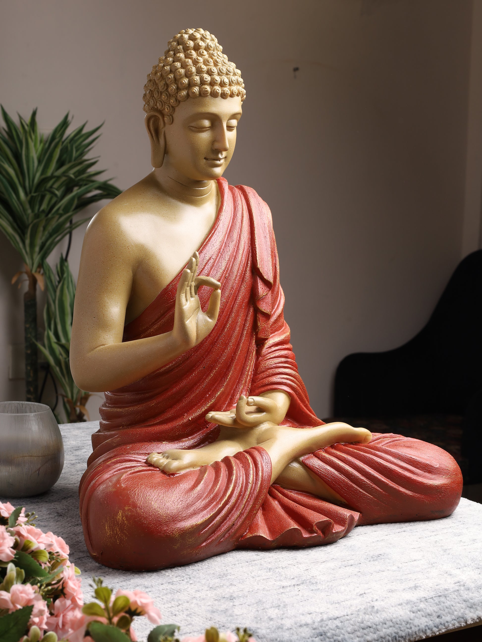 This serene statue of Lord Gautam Buddha captures the essence of meditation and inner peace. Crafted from fiber and resin, it features lifelike detailing with a radiant golden finish and a flowing red robe. The statue radiates calm and mindfulness, making it an ideal centerpiece for meditation corners or spiritual spaces. A symbol of harmony, wisdom, and balance for your home.