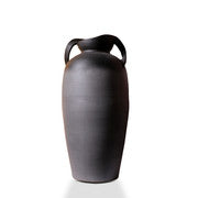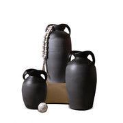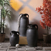 This elegant set of matte black ceramic vases exudes modern minimalism with a rustic charm. Each vase features a smooth, handcrafted finish and graceful curves, perfect for adding depth to any décor. The tall centerpiece vase is accented with a decorative wooden bead garland, enhancing its visual appeal. Ideal for living rooms, entryways, or console styling to bring a sophisticated earthy touch.