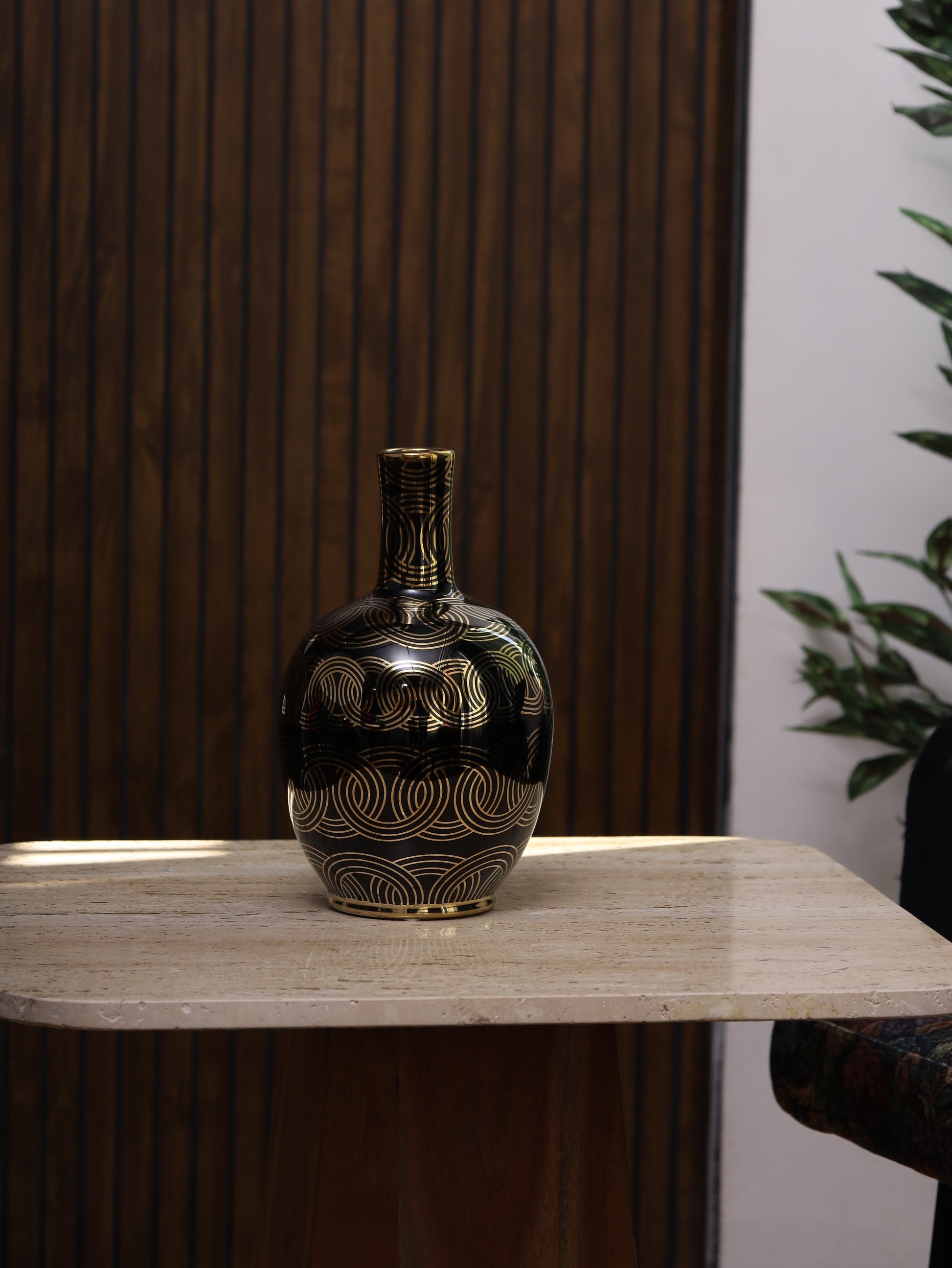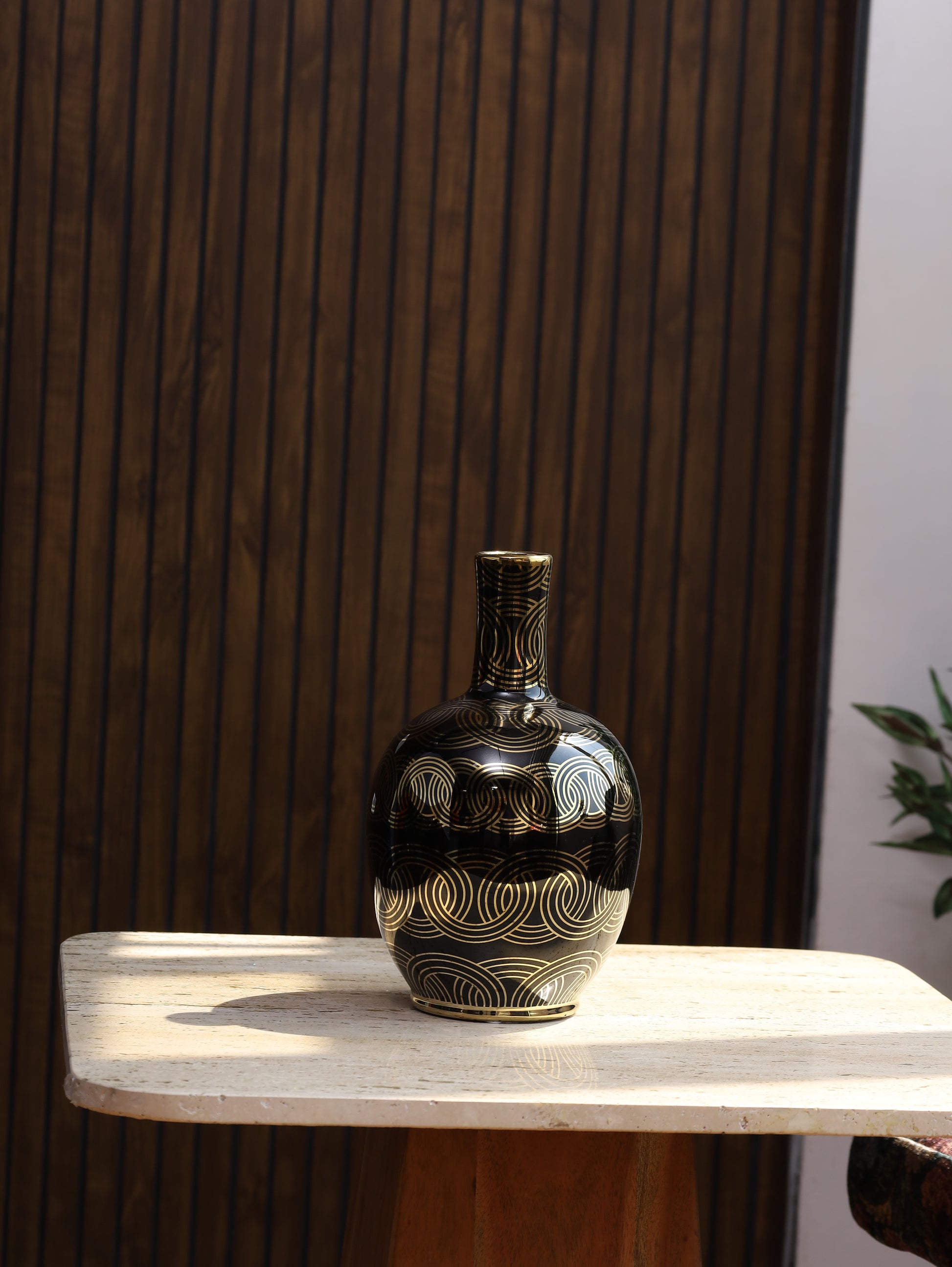 This vintage black ceramic vase, with its captivating golden swirls, is a true embodiment of refined luxury. Each intricate detail speaks to exceptional artistry, transforming any space into a showcase of sophisticated elegance. Elevate your home with this timeless piece, a fusion of classic charm and opulent design.