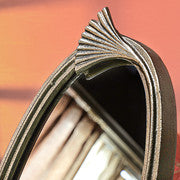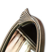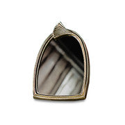 This stylish arched mirror features a sleek metallic gold frame with a unique fan-like accent at the top, adding a touch of artistry. Its elegant curves and antique finish make it a standout decorative piece. Perfect for dressing tables, console setups, or wall accents, it brings a sophisticated charm to any interior. A blend of vintage inspiration and modern elegance for timeless appeal.
